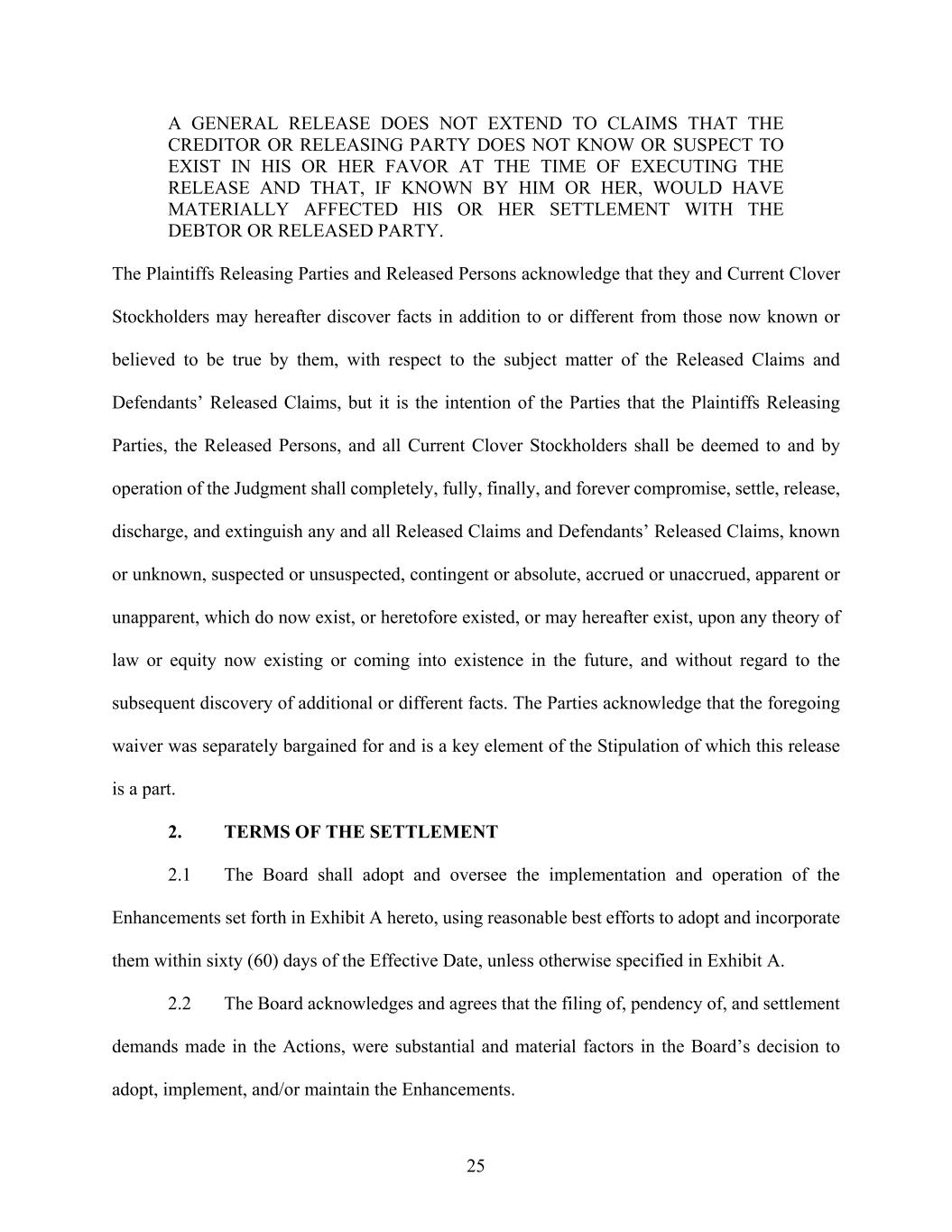25 A GENERAL RELEASE DOES NOT EXTEND TO CLAIMS THAT THE CREDITOR OR RELEASING PARTY DOES NOT KNOW OR SUSPECT TO EXIST IN HIS OR HER FAVOR AT THE TIME OF EXECUTING THE RELEASE AND THAT, IF KNOWN BY HIM OR HER, WOULD HAVE MATERIALLY AFFECTED HIS OR HER SETTLEMENT WITH THE DEBTOR OR RELEASED PARTY. The Plaintiffs Releasing Parties and Released Persons acknowledge that they and Current Clover Stockholders may hereafter discover facts in addition to or different from those now known or believed to be true by them, with respect to the subject matter of the Released Claims and Defendants’ Released Claims, but it is the intention of the Parties that the Plaintiffs Releasing Parties, the Released Persons, and all Current Clover Stockholders shall be deemed to and by operation of the Judgment shall completely, fully, finally, and forever compromise, settle, release, discharge, and extinguish any and all Released Claims and Defendants’ Released Claims, known or unknown, suspected or unsuspected, contingent or absolute, accrued or unaccrued, apparent or unapparent, which do now exist, or heretofore existed, or may hereafter exist, upon any theory of law or equity now existing or coming into existence in the future, and without regard to the subsequent discovery of additional or different facts. The Parties acknowledge that the foregoing waiver was separately bargained for and is a key element of the Stipulation of which this release is a part. 2. TERMS OF THE SETTLEMENT 2.1 The Board shall adopt and oversee the implementation and operation of the Enhancements set forth in Exhibit A hereto, using reasonable best efforts to adopt and incorporate them within sixty (60) days of the Effective Date, unless otherwise specified in Exhibit A. 2.2 The Board acknowledges and agrees that the filing of, pendency of, and settlement demands made in the Actions, were substantial and material factors in the Board’s decision to adopt, implement, and/or maintain the Enhancements.