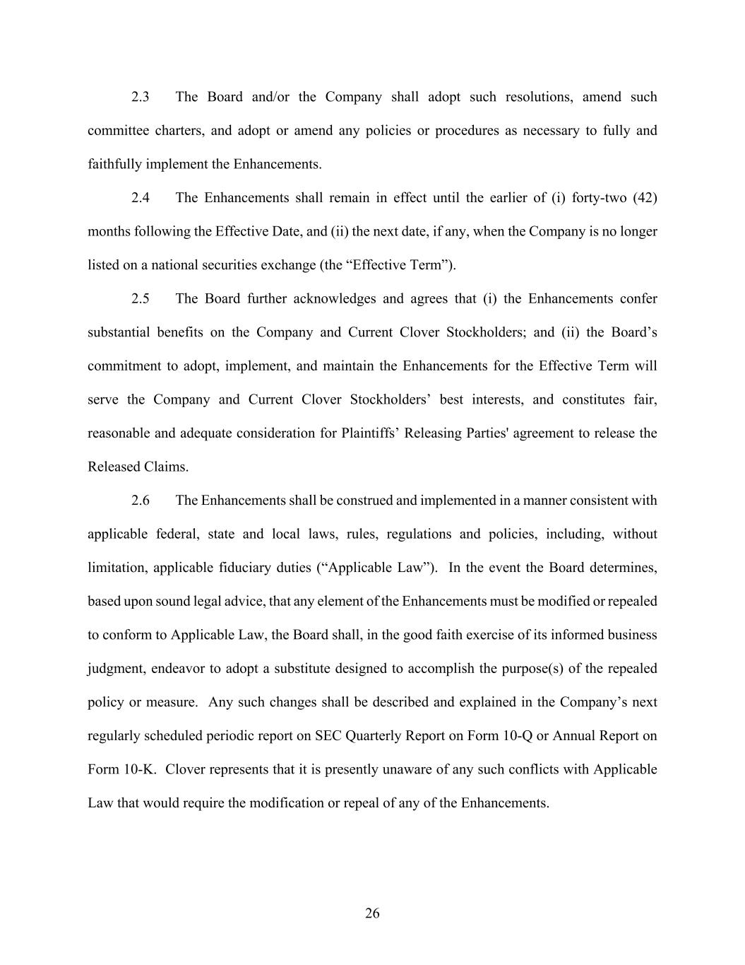 26 2.3 The Board and/or the Company shall adopt such resolutions, amend such committee charters, and adopt or amend any policies or procedures as necessary to fully and faithfully implement the Enhancements. 2.4 The Enhancements shall remain in effect until the earlier of (i) forty-two (42) months following the Effective Date, and (ii) the next date, if any, when the Company is no longer listed on a national securities exchange (the “Effective Term”). 2.5 The Board further acknowledges and agrees that (i) the Enhancements confer substantial benefits on the Company and Current Clover Stockholders; and (ii) the Board’s commitment to adopt, implement, and maintain the Enhancements for the Effective Term will serve the Company and Current Clover Stockholders’ best interests, and constitutes fair, reasonable and adequate consideration for Plaintiffs’ Releasing Parties' agreement to release the Released Claims. 2.6 The Enhancements shall be construed and implemented in a manner consistent with applicable federal, state and local laws, rules, regulations and policies, including, without limitation, applicable fiduciary duties (“Applicable Law”). In the event the Board determines, based upon sound legal advice, that any element of the Enhancements must be modified or repealed to conform to Applicable Law, the Board shall, in the good faith exercise of its informed business judgment, endeavor to adopt a substitute designed to accomplish the purpose(s) of the repealed policy or measure. Any such changes shall be described and explained in the Company’s next regularly scheduled periodic report on SEC Quarterly Report on Form 10-Q or Annual Report on Form 10-K. Clover represents that it is presently unaware of any such conflicts with Applicable Law that would require the modification or repeal of any of the Enhancements.