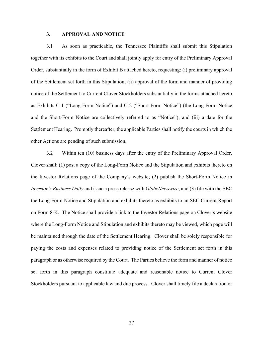 27 3. APPROVAL AND NOTICE 3.1 As soon as practicable, the Tennessee Plaintiffs shall submit this Stipulation together with its exhibits to the Court and shall jointly apply for entry of the Preliminary Approval Order, substantially in the form of Exhibit B attached hereto, requesting: (i) preliminary approval of the Settlement set forth in this Stipulation; (ii) approval of the form and manner of providing notice of the Settlement to Current Clover Stockholders substantially in the forms attached hereto as Exhibits C-1 (“Long-Form Notice”) and C-2 (“Short-Form Notice”) (the Long-Form Notice and the Short-Form Notice are collectively referred to as “Notice”); and (iii) a date for the Settlement Hearing. Promptly thereafter, the applicable Parties shall notify the courts in which the other Actions are pending of such submission. 3.2 Within ten (10) business days after the entry of the Preliminary Approval Order, Clover shall: (1) post a copy of the Long-Form Notice and the Stipulation and exhibits thereto on the Investor Relations page of the Company’s website; (2) publish the Short-Form Notice in Investor’s Business Daily and issue a press release with GlobeNewswire; and (3) file with the SEC the Long-Form Notice and Stipulation and exhibits thereto as exhibits to an SEC Current Report on Form 8-K. The Notice shall provide a link to the Investor Relations page on Clover’s website where the Long-Form Notice and Stipulation and exhibits thereto may be viewed, which page will be maintained through the date of the Settlement Hearing. Clover shall be solely responsible for paying the costs and expenses related to providing notice of the Settlement set forth in this paragraph or as otherwise required by the Court. The Parties believe the form and manner of notice set forth in this paragraph constitute adequate and reasonable notice to Current Clover Stockholders pursuant to applicable law and due process. Clover shall timely file a declaration or