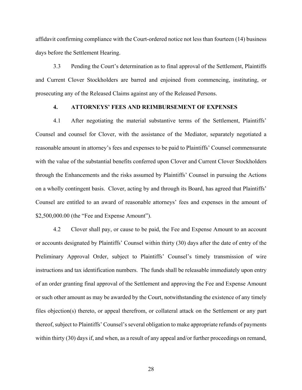 28 affidavit confirming compliance with the Court-ordered notice not less than fourteen (14) business days before the Settlement Hearing. 3.3 Pending the Court’s determination as to final approval of the Settlement, Plaintiffs and Current Clover Stockholders are barred and enjoined from commencing, instituting, or prosecuting any of the Released Claims against any of the Released Persons. 4. ATTORNEYS’ FEES AND REIMBURSEMENT OF EXPENSES 4.1 After negotiating the material substantive terms of the Settlement, Plaintiffs’ Counsel and counsel for Clover, with the assistance of the Mediator, separately negotiated a reasonable amount in attorney’s fees and expenses to be paid to Plaintiffs’ Counsel commensurate with the value of the substantial benefits conferred upon Clover and Current Clover Stockholders through the Enhancements and the risks assumed by Plaintiffs’ Counsel in pursuing the Actions on a wholly contingent basis. Clover, acting by and through its Board, has agreed that Plaintiffs’ Counsel are entitled to an award of reasonable attorneys’ fees and expenses in the amount of $2,500,000.00 (the “Fee and Expense Amount”). 4.2 Clover shall pay, or cause to be paid, the Fee and Expense Amount to an account or accounts designated by Plaintiffs’ Counsel within thirty (30) days after the date of entry of the Preliminary Approval Order, subject to Plaintiffs’ Counsel’s timely transmission of wire instructions and tax identification numbers. The funds shall be releasable immediately upon entry of an order granting final approval of the Settlement and approving the Fee and Expense Amount or such other amount as may be awarded by the Court, notwithstanding the existence of any timely files objection(s) thereto, or appeal therefrom, or collateral attack on the Settlement or any part thereof, subject to Plaintiffs’ Counsel’s several obligation to make appropriate refunds of payments within thirty (30) days if, and when, as a result of any appeal and/or further proceedings on remand,