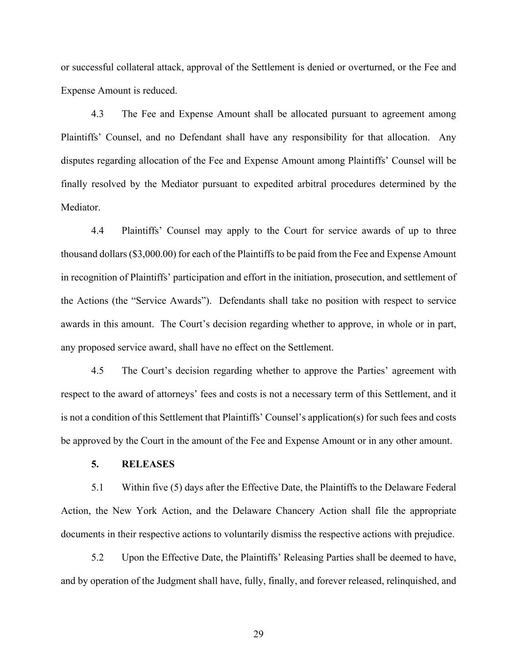 29 or successful collateral attack, approval of the Settlement is denied or overturned, or the Fee and Expense Amount is reduced. 4.3 The Fee and Expense Amount shall be allocated pursuant to agreement among Plaintiffs’ Counsel, and no Defendant shall have any responsibility for that allocation. Any disputes regarding allocation of the Fee and Expense Amount among Plaintiffs’ Counsel will be finally resolved by the Mediator pursuant to expedited arbitral procedures determined by the Mediator. 4.4 Plaintiffs’ Counsel may apply to the Court for service awards of up to three thousand dollars ($3,000.00) for each of the Plaintiffs to be paid from the Fee and Expense Amount in recognition of Plaintiffs’ participation and effort in the initiation, prosecution, and settlement of the Actions (the “Service Awards”). Defendants shall take no position with respect to service awards in this amount. The Court’s decision regarding whether to approve, in whole or in part, any proposed service award, shall have no effect on the Settlement. 4.5 The Court’s decision regarding whether to approve the Parties’ agreement with respect to the award of attorneys’ fees and costs is not a necessary term of this Settlement, and it is not a condition of this Settlement that Plaintiffs’ Counsel’s application(s) for such fees and costs be approved by the Court in the amount of the Fee and Expense Amount or in any other amount. 5. RELEASES 5.1 Within five (5) days after the Effective Date, the Plaintiffs to the Delaware Federal Action, the New York Action, and the Delaware Chancery Action shall file the appropriate documents in their respective actions to voluntarily dismiss the respective actions with prejudice. 5.2 Upon the Effective Date, the Plaintiffs’ Releasing Parties shall be deemed to have, and by operation of the Judgment shall have, fully, finally, and forever released, relinquished, and