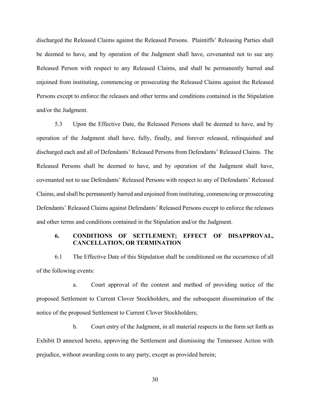 30 discharged the Released Claims against the Released Persons. Plaintiffs’ Releasing Parties shall be deemed to have, and by operation of the Judgment shall have, covenanted not to sue any Released Person with respect to any Released Claims, and shall be permanently barred and enjoined from instituting, commencing or prosecuting the Released Claims against the Released Persons except to enforce the releases and other terms and conditions contained in the Stipulation and/or the Judgment. 5.3 Upon the Effective Date, the Released Persons shall be deemed to have, and by operation of the Judgment shall have, fully, finally, and forever released, relinquished and discharged each and all of Defendants’ Released Persons from Defendants’ Released Claims. The Released Persons shall be deemed to have, and by operation of the Judgment shall have, covenanted not to sue Defendants’ Released Persons with respect to any of Defendants’ Released Claims, and shall be permanently barred and enjoined from instituting, commencing or prosecuting Defendants’ Released Claims against Defendants’ Released Persons except to enforce the releases and other terms and conditions contained in the Stipulation and/or the Judgment. 6. CONDITIONS OF SETTLEMENT; EFFECT OF DISAPPROVAL, CANCELLATION, OR TERMINATION 6.1 The Effective Date of this Stipulation shall be conditioned on the occurrence of all of the following events: a. Court approval of the content and method of providing notice of the proposed Settlement to Current Clover Stockholders, and the subsequent dissemination of the notice of the proposed Settlement to Current Clover Stockholders; b. Court entry of the Judgment, in all material respects in the form set forth as Exhibit D annexed hereto, approving the Settlement and dismissing the Tennessee Action with prejudice, without awarding costs to any party, except as provided herein;