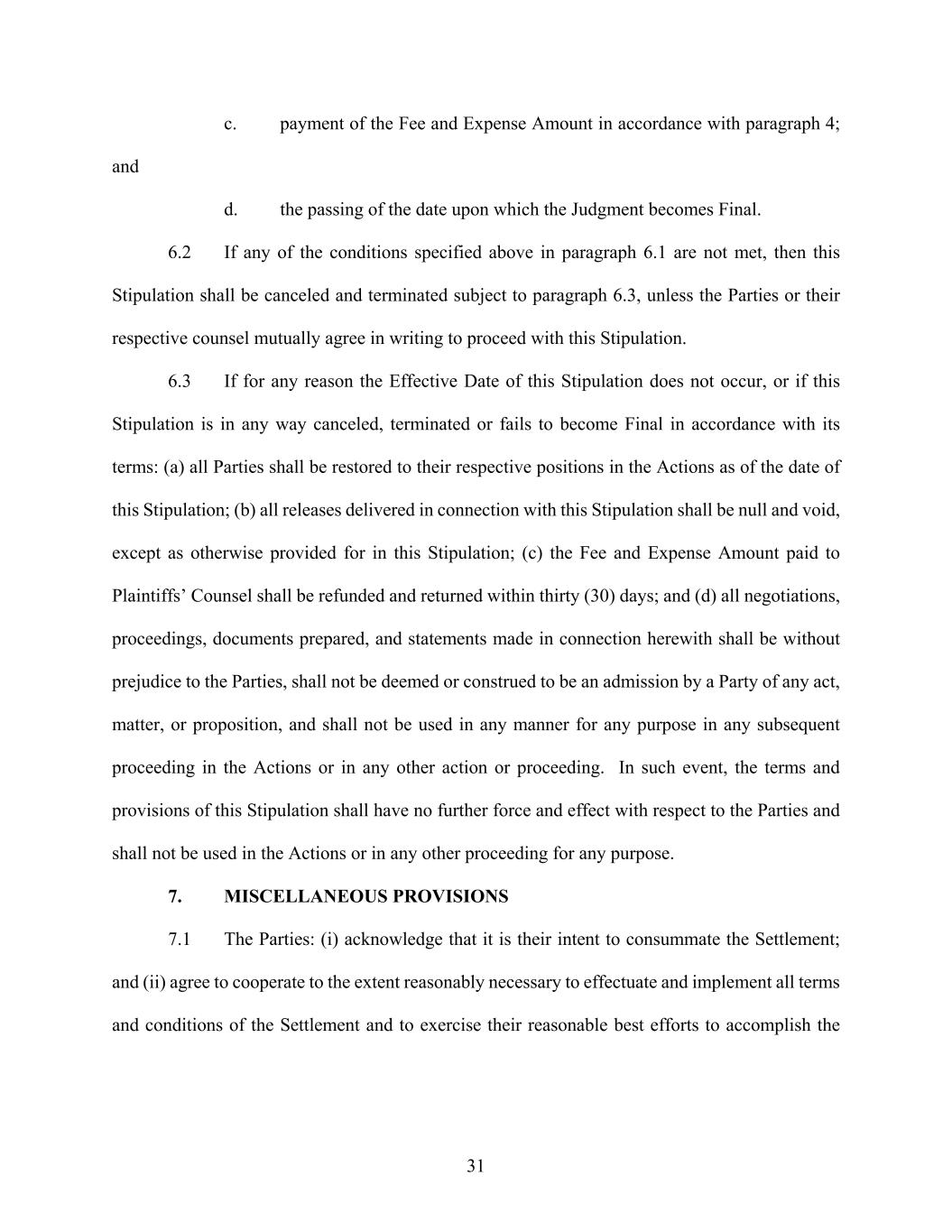 31 c. payment of the Fee and Expense Amount in accordance with paragraph 4; and d. the passing of the date upon which the Judgment becomes Final. 6.2 If any of the conditions specified above in paragraph 6.1 are not met, then this Stipulation shall be canceled and terminated subject to paragraph 6.3, unless the Parties or their respective counsel mutually agree in writing to proceed with this Stipulation. 6.3 If for any reason the Effective Date of this Stipulation does not occur, or if this Stipulation is in any way canceled, terminated or fails to become Final in accordance with its terms: (a) all Parties shall be restored to their respective positions in the Actions as of the date of this Stipulation; (b) all releases delivered in connection with this Stipulation shall be null and void, except as otherwise provided for in this Stipulation; (c) the Fee and Expense Amount paid to Plaintiffs’ Counsel shall be refunded and returned within thirty (30) days; and (d) all negotiations, proceedings, documents prepared, and statements made in connection herewith shall be without prejudice to the Parties, shall not be deemed or construed to be an admission by a Party of any act, matter, or proposition, and shall not be used in any manner for any purpose in any subsequent proceeding in the Actions or in any other action or proceeding. In such event, the terms and provisions of this Stipulation shall have no further force and effect with respect to the Parties and shall not be used in the Actions or in any other proceeding for any purpose. 7. MISCELLANEOUS PROVISIONS 7.1 The Parties: (i) acknowledge that it is their intent to consummate the Settlement; and (ii) agree to cooperate to the extent reasonably necessary to effectuate and implement all terms and conditions of the Settlement and to exercise their reasonable best efforts to accomplish the
