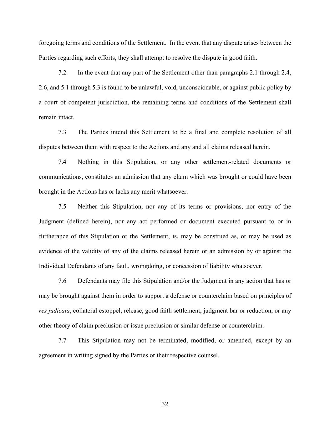 32 foregoing terms and conditions of the Settlement. In the event that any dispute arises between the Parties regarding such efforts, they shall attempt to resolve the dispute in good faith. 7.2 In the event that any part of the Settlement other than paragraphs 2.1 through 2.4, 2.6, and 5.1 through 5.3 is found to be unlawful, void, unconscionable, or against public policy by a court of competent jurisdiction, the remaining terms and conditions of the Settlement shall remain intact. 7.3 The Parties intend this Settlement to be a final and complete resolution of all disputes between them with respect to the Actions and any and all claims released herein. 7.4 Nothing in this Stipulation, or any other settlement-related documents or communications, constitutes an admission that any claim which was brought or could have been brought in the Actions has or lacks any merit whatsoever. 7.5 Neither this Stipulation, nor any of its terms or provisions, nor entry of the Judgment (defined herein), nor any act performed or document executed pursuant to or in furtherance of this Stipulation or the Settlement, is, may be construed as, or may be used as evidence of the validity of any of the claims released herein or an admission by or against the Individual Defendants of any fault, wrongdoing, or concession of liability whatsoever. 7.6 Defendants may file this Stipulation and/or the Judgment in any action that has or may be brought against them in order to support a defense or counterclaim based on principles of res judicata, collateral estoppel, release, good faith settlement, judgment bar or reduction, or any other theory of claim preclusion or issue preclusion or similar defense or counterclaim. 7.7 This Stipulation may not be terminated, modified, or amended, except by an agreement in writing signed by the Parties or their respective counsel.