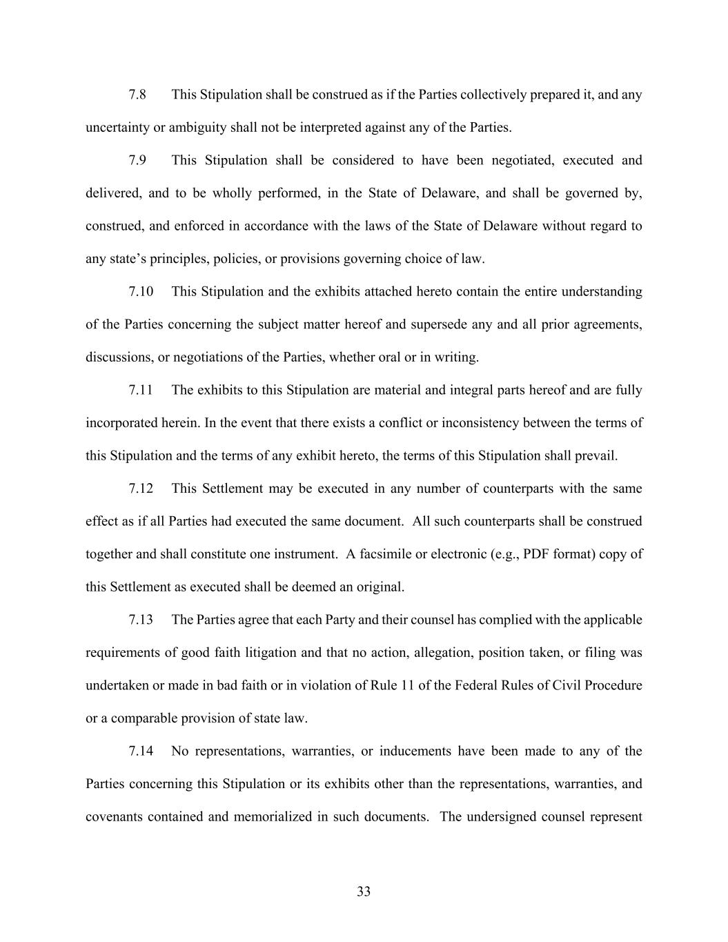 33 7.8 This Stipulation shall be construed as if the Parties collectively prepared it, and any uncertainty or ambiguity shall not be interpreted against any of the Parties. 7.9 This Stipulation shall be considered to have been negotiated, executed and delivered, and to be wholly performed, in the State of Delaware, and shall be governed by, construed, and enforced in accordance with the laws of the State of Delaware without regard to any state’s principles, policies, or provisions governing choice of law. 7.10 This Stipulation and the exhibits attached hereto contain the entire understanding of the Parties concerning the subject matter hereof and supersede any and all prior agreements, discussions, or negotiations of the Parties, whether oral or in writing. 7.11 The exhibits to this Stipulation are material and integral parts hereof and are fully incorporated herein. In the event that there exists a conflict or inconsistency between the terms of this Stipulation and the terms of any exhibit hereto, the terms of this Stipulation shall prevail. 7.12 This Settlement may be executed in any number of counterparts with the same effect as if all Parties had executed the same document. All such counterparts shall be construed together and shall constitute one instrument. A facsimile or electronic (e.g., PDF format) copy of this Settlement as executed shall be deemed an original. 7.13 The Parties agree that each Party and their counsel has complied with the applicable requirements of good faith litigation and that no action, allegation, position taken, or filing was undertaken or made in bad faith or in violation of Rule 11 of the Federal Rules of Civil Procedure or a comparable provision of state law. 7.14 No representations, warranties, or inducements have been made to any of the Parties concerning this Stipulation or its exhibits other than the representations, warranties, and covenants contained and memorialized in such documents. The undersigned counsel represent