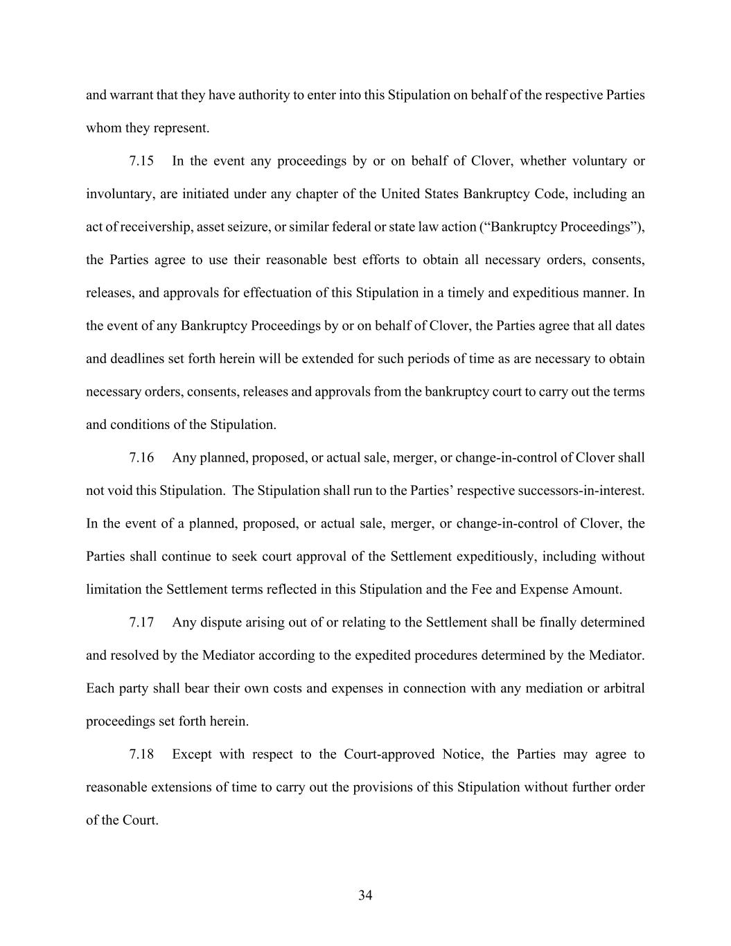 34 and warrant that they have authority to enter into this Stipulation on behalf of the respective Parties whom they represent. 7.15 In the event any proceedings by or on behalf of Clover, whether voluntary or involuntary, are initiated under any chapter of the United States Bankruptcy Code, including an act of receivership, asset seizure, or similar federal or state law action (“Bankruptcy Proceedings”), the Parties agree to use their reasonable best efforts to obtain all necessary orders, consents, releases, and approvals for effectuation of this Stipulation in a timely and expeditious manner. In the event of any Bankruptcy Proceedings by or on behalf of Clover, the Parties agree that all dates and deadlines set forth herein will be extended for such periods of time as are necessary to obtain necessary orders, consents, releases and approvals from the bankruptcy court to carry out the terms and conditions of the Stipulation. 7.16 Any planned, proposed, or actual sale, merger, or change-in-control of Clover shall not void this Stipulation. The Stipulation shall run to the Parties’ respective successors-in-interest. In the event of a planned, proposed, or actual sale, merger, or change-in-control of Clover, the Parties shall continue to seek court approval of the Settlement expeditiously, including without limitation the Settlement terms reflected in this Stipulation and the Fee and Expense Amount. 7.17 Any dispute arising out of or relating to the Settlement shall be finally determined and resolved by the Mediator according to the expedited procedures determined by the Mediator. Each party shall bear their own costs and expenses in connection with any mediation or arbitral proceedings set forth herein. 7.18 Except with respect to the Court-approved Notice, the Parties may agree to reasonable extensions of time to carry out the provisions of this Stipulation without further order of the Court.