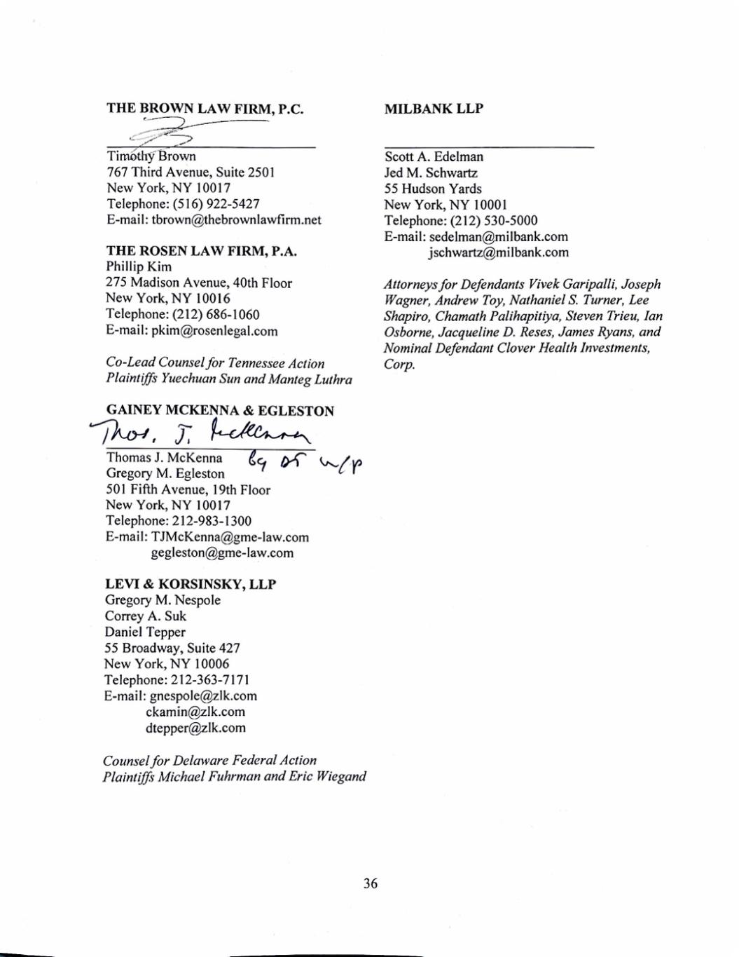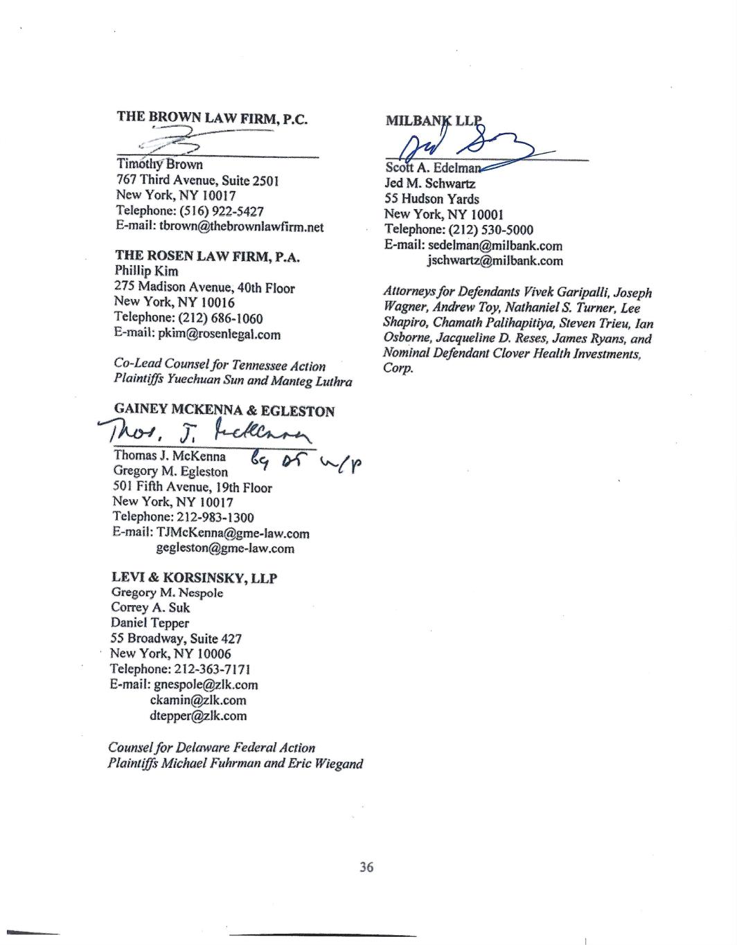 THE BROWN LAW FIRM, P.C. TimóthyBrown 767 Third Avenue, Suite 2501 New York, NY 10017 Telephone: (516) 922-5427 E-mail: tbrown@thebrownlawfirm.net THE ROSEN LAW FIRM, P.A. Phillip Kim 275 Madison Avenue, 40th Floor New York, NY 10016 Telephone: (212) 686-1060 E-mail: pkim@rosenlegal.com Co-Lead Counselfor TennesseeAction Plaintiffs YuechuanSun and Manteg Luthra GAINEY MCKENNA &EGLESTON Jho, S heke Thomas J. McKenna Gregory M. Egleston 501 Fifth Avenue, 19th Floor New York, NY 10017 Telephone: 212-983-1300 E-mail: TJMcKenna@gme-law.com gegleston@gme-law.com LEVI & KORSINSKY, LLP Gregory M. Nespole Correy A. Suk Daniel Tepper 55 Broadway, Suite 427 New York, NY 10006 Telephone: 212-363-7171 E-mail: gnespole@zlk.com ckamin@zlk.com dtepper@zlk.com Counsel for DelawareFederalAction Plaintiffs Michael Fuhrman and Eric Wiegand 36 MILBANK LLP Scott A. Edelman Jed M. Schwartz 5S Hudson Yards New York, NY 1000I Telephone: (212) 530-5000 E-mail: sedelman@milbank.com jschwartz@milbank.com Attorneys for Defendants Vivek Garipalli, Joseph Wagner, Anărew Toy, Nathaniel S. Turner, Lee Shapiro, Chamath Palihapitiya, Steven Trieu, lan Osborne, Jacqueline D. Reses, James Ryans, and Nominal Defendant Clover Health Investments, Corp.