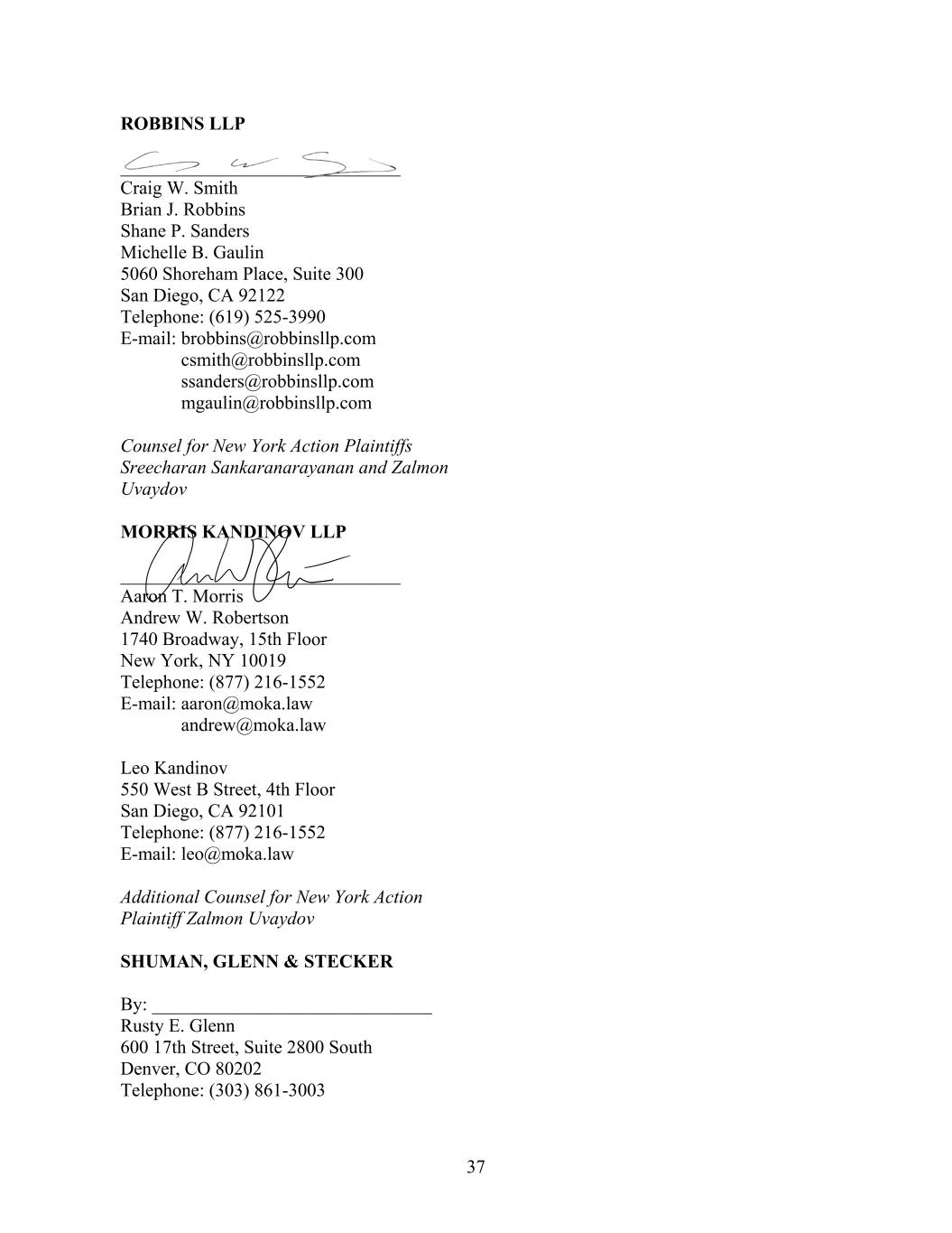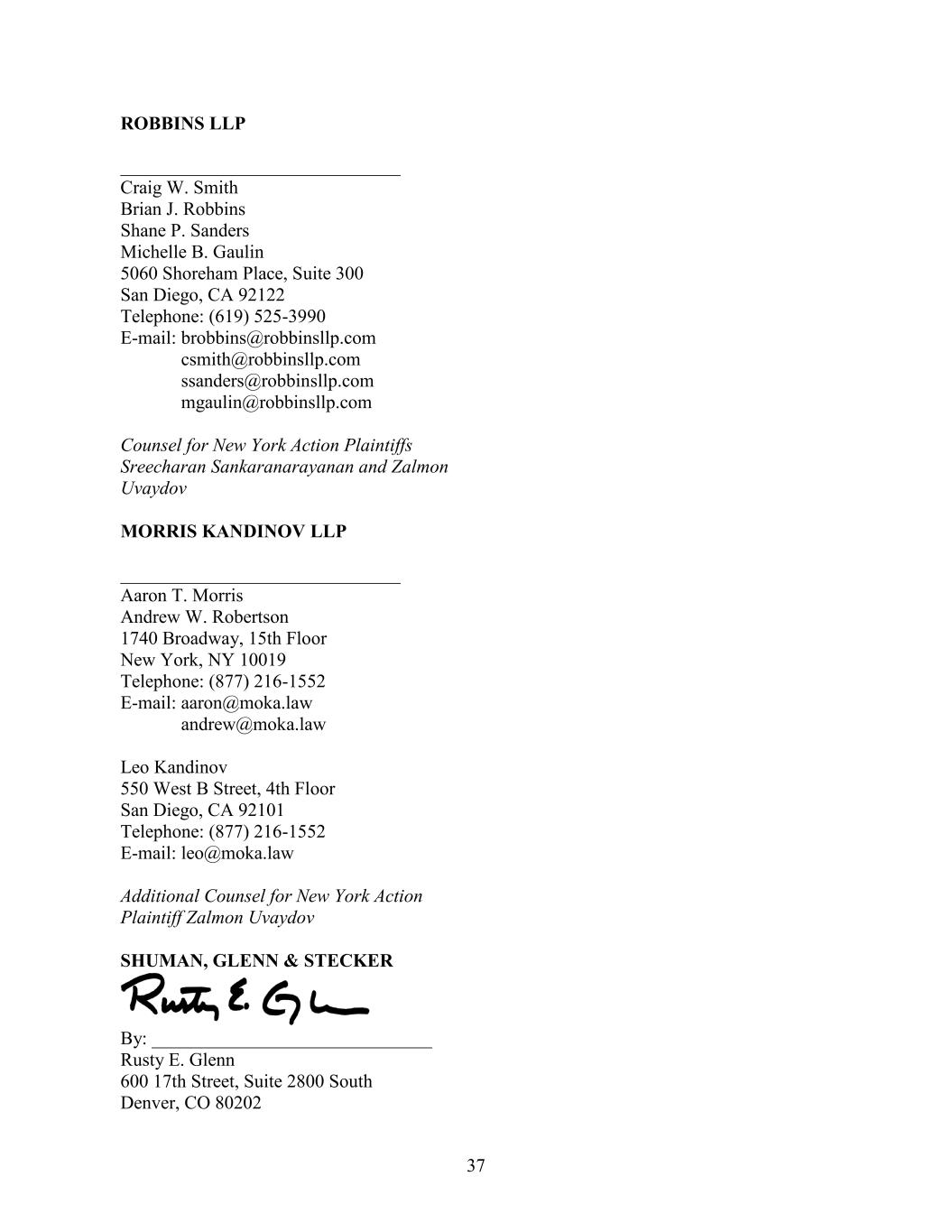 37 ROBBINS LLP ______________________________ Craig W. Smith Brian J. Robbins Shane P. Sanders Michelle B. Gaulin 5060 Shoreham Place, Suite 300 San Diego, CA 92122 Telephone: (619) 525-3990 E-mail: brobbins@robbinsllp.com csmith@robbinsllp.com ssanders@robbinsllp.com mgaulin@robbinsllp.com Counsel for New York Action Plaintiffs Sreecharan Sankaranarayanan and Zalmon Uvaydov MORRIS KANDINOV LLP ______________________________ Aaron T. Morris Andrew W. Robertson 1740 Broadway, 15th Floor New York, NY 10019 Telephone: (877) 216-1552 E-mail: aaron@moka.law andrew@moka.law Leo Kandinov 550 West B Street, 4th Floor San Diego, CA 92101 Telephone: (877) 216-1552 E-mail: leo@moka.law Additional Counsel for New York Action Plaintiff Zalmon Uvaydov SHUMAN, GLENN & STECKER By: ______________________________ Rusty E. Glenn 600 17th Street, Suite 2800 South Denver, CO 80202