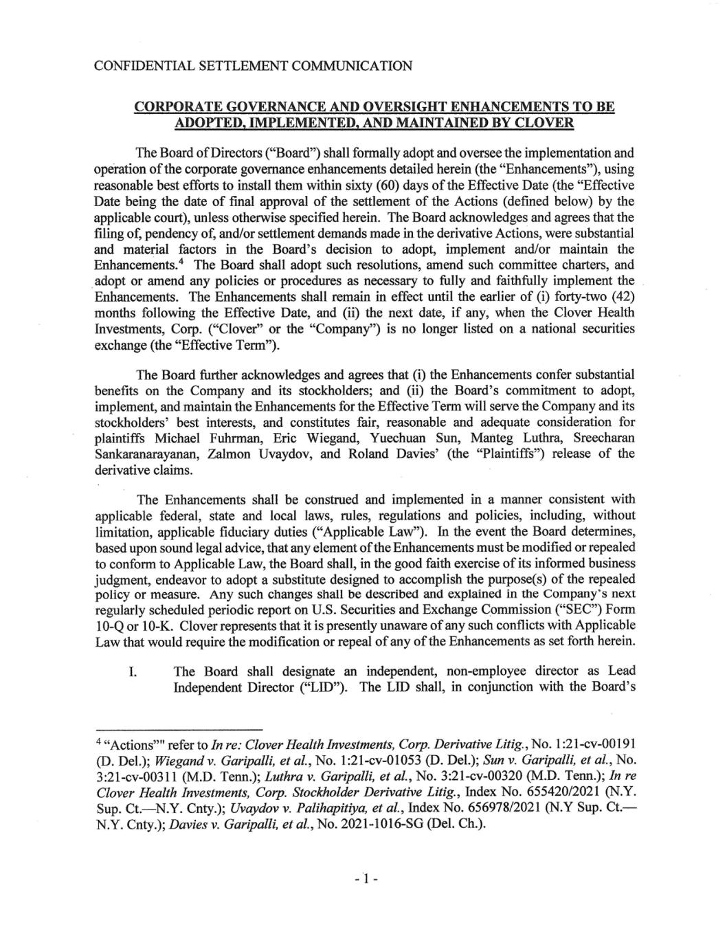 CONFIDENTIAL SETTLEMENT COMMUNICATION CORPORATE GOVERNANCE AND OVERSIGHT ENHANCEMENTS TO BE ADOPTED, IMPLEMENTED, AND MAINTAINED BY CLOVER The Board of Directors (“Board”) shall formally adopt and oversee the implementation and operation of the corporate governance enhancements detailed herein (the “Enhancements”), using reasonable best efforts to install them within sixty (60) days of the Effective Date (the “Effective Date being the date of final approval of the settlement of the Actions (defined below) by the applicable court), unless otherwise specified herein. The Board acknowledges and agrees that the filing of, pendency of, and/or settlement demands made in the derivative Actions, were substantial and material factors in the Board’s decision to adopt, implement and/or maintain the Enhancements.* The Board shall adopt such resolutions, amend such committee charters, and adopt or amend any policies or procedures as necessary to fully and faithfully implement the Enhancements. The Enhancements shall remain in effect until the earlier of (i) forty-two (42) months following the Effective Date, and (ii) the next date, if any, when the Clover Health Investments, Corp. (“Clover” or the “Company”) is no longer listed on a national securities exchange (the “Effective Term”). The Board further acknowledges and agrees that (i) the Enhancements confer substantial benefits on the Company and its stockholders; and (ii) the Board’s commitment to adopt, implement, and maintain the Enhancements for the Effective Term will serve the Company and its stockholders’ best interests, and constitutes fair, reasonable and adequate consideration for plaintiffs Michael Fuhrman, Eric Wiegand, Yuechuan Sun, Manteg Luthra, Sreecharan Sankaranarayanan, Zalmon Uvaydov, and Roland Davies’ (the “Plaintiffs”) release of the derivative claims. The Enhancements shall be construed and implemented in a manner consistent with applicable federal, state and local laws, rules, regulations and policies, including, without limitation, applicable fiduciary duties (“Applicable Law”). In the event the Board determines, based upon sound legal advice, that any element of the Enhancements must be modified or repealed to conform to Applicable Law, the Board shall, in the good faith exercise of its informed business judgment, endeavor to adopt a substitute designed to accomplish the purpose(s) of the repealed policy or measure. Any such changes shall be described and explained in the Company’s next regularly scheduled periodic report on U.S. Securities and Exchange Commission (“SEC”) Form 10-Q or 10-K. Clover represents that it is presently unaware of any such conflicts with Applicable Law that would require the modification or repeal of any of the Enhancements as set forth herein. I. The Board shall designate an independent, non-employee director as Lead Independent Director (“LID”). The LID shall, in conjunction with the Board’s 4“ A ctions”" refer to In re: Clover Health Investments, Corp. Derivative Litig., No. 1:21-cv-00191 (D. Del.); Wiegand v. Garipalli, et al., No. 1:21-cv-01053 (D. Del.); Sun v. Garipalli, et al., No. 3:21-cv-00311 (M.D. Tenn.); Luthra v. Garipalli, et al., No. 3:21-cv-00320 (M.D. Tenn.); In re Clover Health Investments, Corp. Stockholder Derivative Litig., Index No. 655420/2021 (N.Y. Sup. Ct.—N.Y. Cnty.); Uvaydov v. Palihapitiya, et al., Index No. 656978/2021 (N.Y Sup. Ct— N.Y. Cnty.); Davies v. Garipalli, et al., No. 2021-1016-SG (Del. Ch.).