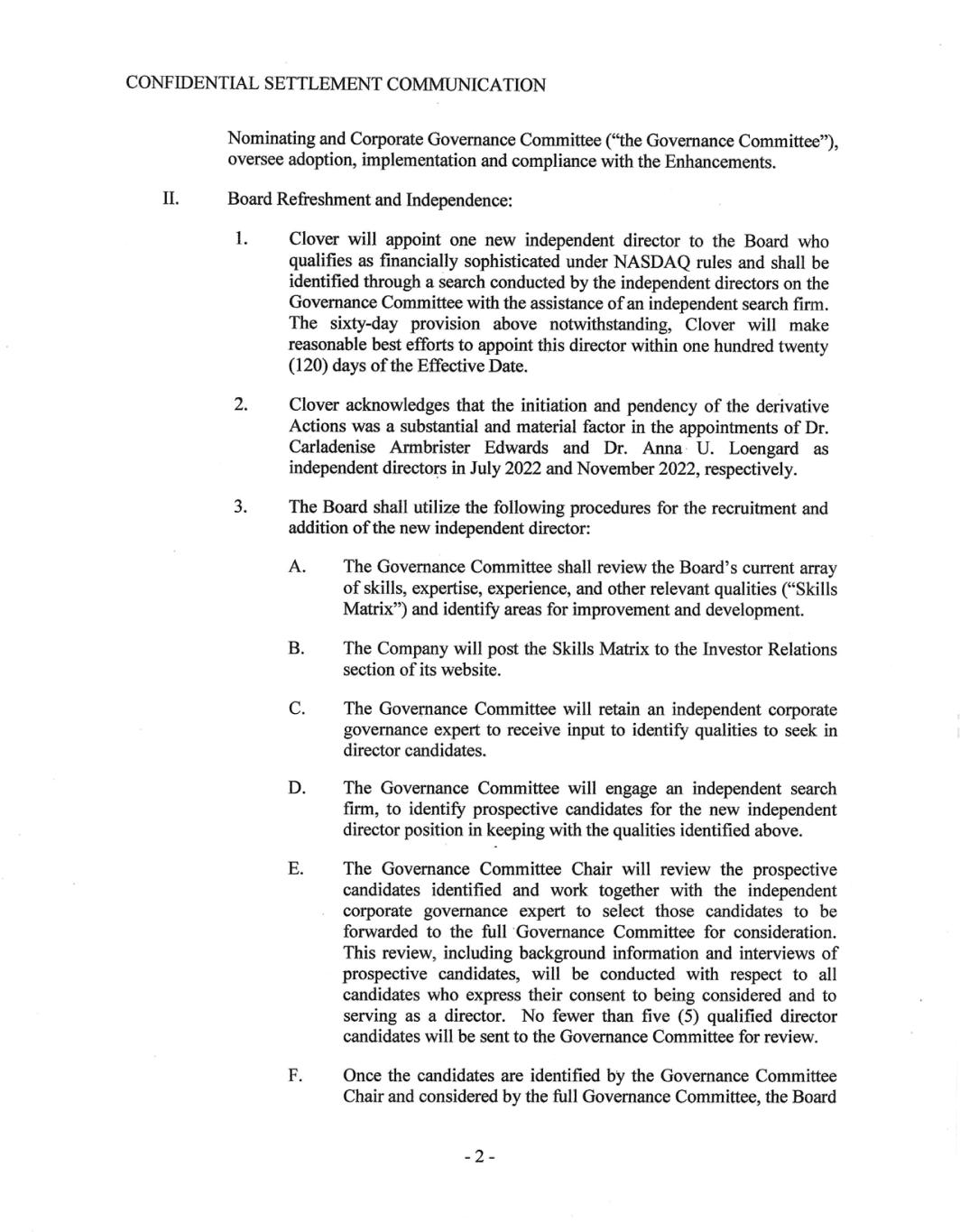 CONFIDENTIAL SETTLEMENT COMMUNICATION Nominating and Corporate Governance Committee (“the Governance Committee”), oversee adoption, implementation and compliance with the Enhancements. Il. Board Refreshment and Independence: 1. Clover will appoint one new independent director to the Board who qualifies as financially sophisticated under NASDAQ rules and shall be identified through a search conducted by the independent directors on the Governance Committee with the assistance of an independent search firm. The sixty-day provision above notwithstanding, Clover will make reasonable best efforts to appoint this director within one hundred twenty (120) days of the Effective Date. Ze Clover acknowledges that the initiation and pendency of the derivative Actions was a substantial and material factor in the appointments of Dr. Carladenise Armbrister Edwards and Dr. Anna: U. Loengard as independent directors in July 2022 and November 2022, respectively. 3, The Board shall utilize the following procedures for the recruitment and addition of the new independent director: A. The Governance Committee shall review the Board’s current array of skills, expertise, experience, and other relevant qualities (“Skills Matrix”) and identify areas for improvement and development. B. The Company will post the Skills Matrix to the Investor Relations section of its website. Cc, The Governance Committee will retain an independent corporate governance expert to receive input to identify qualities to seek in director candidates. D. The Governance Committee will engage an independent search firm, to identify prospective candidates for the new independent director position in keeping with the qualities identified above. E. The Governance Committee Chair will review the prospective candidates identified and work together with the independent corporate governance expert to select those candidates to be forwarded to the full Governance Committee for consideration. This review, including background information and interviews of prospective candidates, will be conducted with respect to all candidates who express their consent to being considered and to serving as a director. No fewer than five (5) qualified director candidates will be sent to the Governance Committee for review. F, Once the candidates are identified by the Governance Committee Chair and considered by the full Governance Committee, the Board = Dn