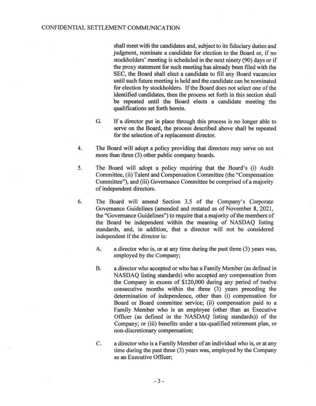 CONFIDENTIAL SETTLEMENT COMMUNICATION shall meet with the candidates and, subject to its fiduciary duties and judgment, nominate a candidate for election to the Board or, if no stockholders’ meeting is scheduled in the next ninety (90) days or if the proxy statement for such meeting has already been filed with the SEC, the Board shall elect a candidate to fill any Board vacancies until such future meeting is held and the candidate can be nominated for election by stockholders. If the Board does not select one of the identified candidates, then the process set forth in this section shall be repeated until the Board elects a candidate meeting the qualifications set forth herein. G. If a director put in place through this process is no longer able to serve on the Board, the process described above shall be repeated for the selection of a replacement director. 4. The Board will adopt a policy providing that directors may serve on not more than three (3) other public company boards. — De The Board will adopt a policy requiring that the Board’s (i) Audit Committee, (ii) Talent and Compensation Committee (the “Compensation Committee”), and (iii) Governance Committee be comprised of a majority of independent directors. 6. The Board will amend Section 3.5 of the Company’s Corporate Governance Guidelines (amended and restated as of November 8, 2021, the “Governance Guidelines”) to require that a majority of the members of the Board be independent within the meaning of NASDAQ listing standards, and, in addition, that a director will not be considered independent if the director is: A. a director who is, or at any time during the past three (3) years was, employed by the Company; B. a director who accepted or who has a Family Member (as defined in NASDAQ listing standards) who accepted any compensation from the Company in excess of $120,000 during any period of twelve consecutive months within the three (3) years preceding the determination of independence, other than (i) compensation for Board or Board committee service; (ii) compensation paid to a Family Member who is an employee (other than an Executive Officer (as defined in the NASDAQ listing standards)) of the Company; or (iii) benefits under a tax-qualified retirement plan, or non-discretionary compensation; C. a director who is a Family Member of an individual who is, or at any time during the past three (3) years was, employed by the Company as an Executive Officer;