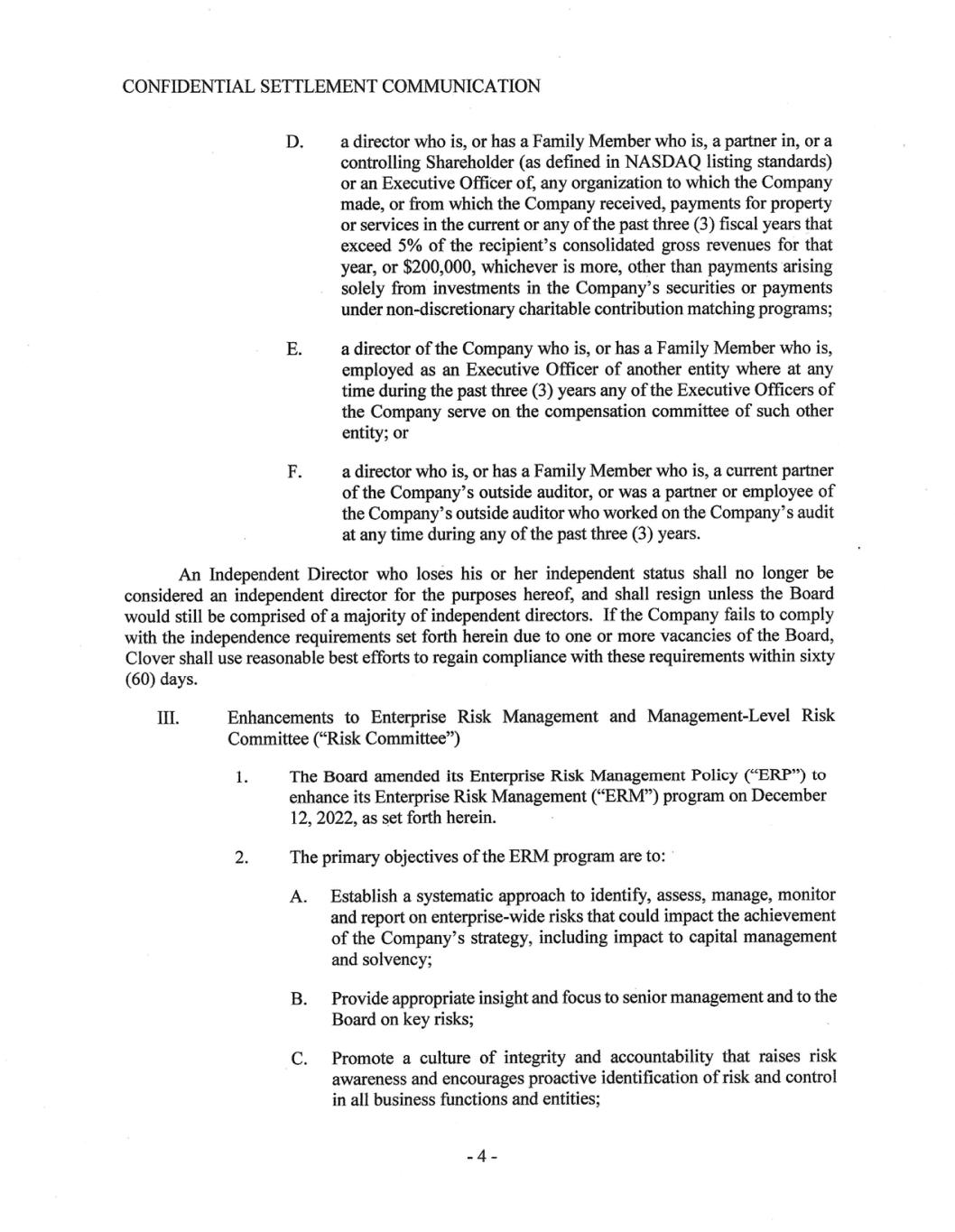 CONFIDENTIAL SETTLEMENT COMMUNICATION D. a director who is, or has a Family Member who is, a partner in, or a controlling Shareholder (as defined in NASDAQ listing standards) or an Executive Officer of, any organization to which the Company made, or from which the Company received, payments for property or services in the current or any of the past three (3) fiscal years that exceed 5% of the recipient’s consolidated gross revenues for that year, or $200,000, whichever is more, other than payments arising solely from investments in the Company’s securities or payments under non-discretionary charitable contribution matching programs; a director of the Company who is, or has a Family Member who is, employed as an Executive Officer of another entity where at any time during the past three (3) years any of the Executive Officers of the Company serve on the compensation committee of such other entity; or a director who is, or has a Family Member who is, a current partner of the Company’s outside auditor, or was a partner or employee of the Company’s outside auditor who worked on the Company’s audit at any time during any of the past three (3) years. An Independent Director who loses his or her independent status shall no longer be considered an independent director for the purposes hereof, and shall resign unless the Board would still be comprised of a majority of independent directors. If the Company fails to comply with the independence requirements set forth herein due to one or more vacancies of the Board, Clover shall use reasonable best efforts to regain compliance with these requirements within sixty (60) days. Il. Enhancements to Enterprise Risk Management and Management-Level Risk Committee (“Risk Committee”) 1. The Board amended its Enterprise Risk Management Policy (“ERP”) to enhance its Enterprise Risk Management (“ERM”) program on December 12, 2022, as set forth herein. The primary objectives of the ERM program are to: A. Establish a systematic approach to identify, assess, manage, monitor and report on enterprise-wide risks that could impact the achievement of the Company’s strategy, including impact to capital management and solvency; Provide appropriate insight and focus to senior management and to the Board on key risks; Promote a culture of integrity and accountability that raises risk awareness and encourages proactive identification of risk and control in all business functions and entities; -4-