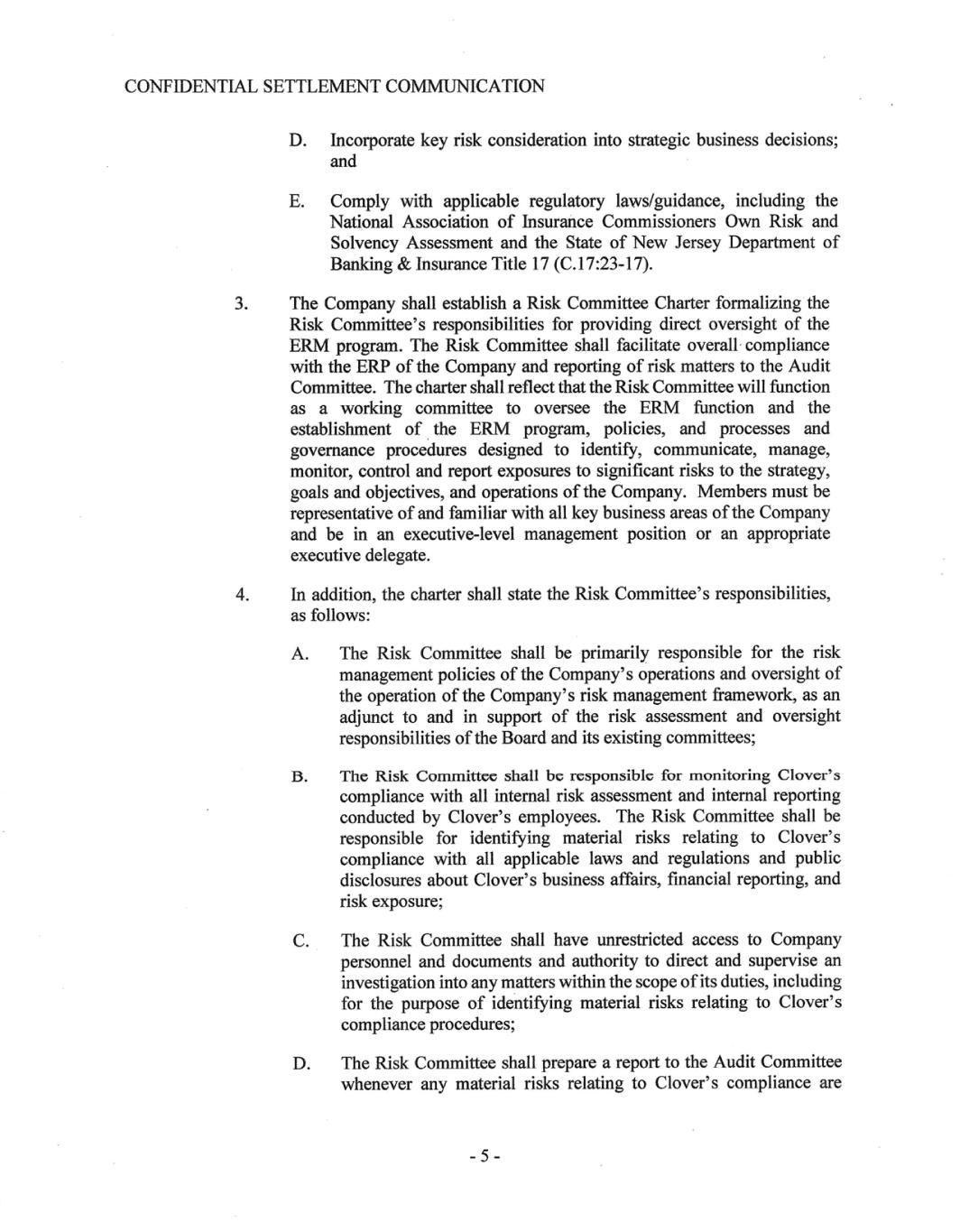 CONFIDENTIAL SETTLEMENT COMMUNICATION D. Incorporate key risk consideration into strategic business decisions; and E. Comply with applicable regulatory laws/guidance, including the National Association of Insurance Commissioners Own Risk and Solvency Assessment and the State of New Jersey Department of Banking & Insurance Title 17 (C.17:23-17). The Company shall establish a Risk Committee Charter formalizing the Risk Committee’s responsibilities for providing direct oversight of the ERM program. The Risk Committee shall facilitate overall: compliance with the ERP of the Company and reporting of risk matters to the Audit Committee. The charter shall reflect that the Risk Committee will function as a working committee to oversee the ERM function and the establishment of the ERM program, policies, and processes and governance procedures designed to identify, communicate, manage, monitor, control and report exposures to significant risks to the strategy, goals and objectives, and operations of the Company. Members must be representative of and familiar with all key business areas of the Company and be in an executive-level management position or an appropriate executive delegate. In addition, the charter shall state the Risk Committee’s responsibilities, as follows: A. The Risk Committee shall be primarily responsible for the risk management policies of the Company’s operations and oversight of the operation of the Company’s risk management framework, as an adjunct to and in support of the risk assessment and oversight responsibilities of the Board and its existing committees; B. The Risk Committee shall be responsible for monitoring Clover’s compliance with all internal risk assessment and internal reporting conducted by Clover’s employees. The Risk Committee shall be responsible for identifying material risks relating to Clover’s compliance with all applicable laws and regulations and public disclosures about Clover’s business affairs, financial reporting, and risk exposure; C. The Risk Committee shall have unrestricted access to Company personnel and documents and authority to direct and supervise an investigation into any matters within the scope of its duties, including for the purpose of identifying material risks relating to Clover’s compliance procedures; D. The Risk Committee shall prepare a report to the Audit Committee whenever any material risks relating to Clover’s compliance are