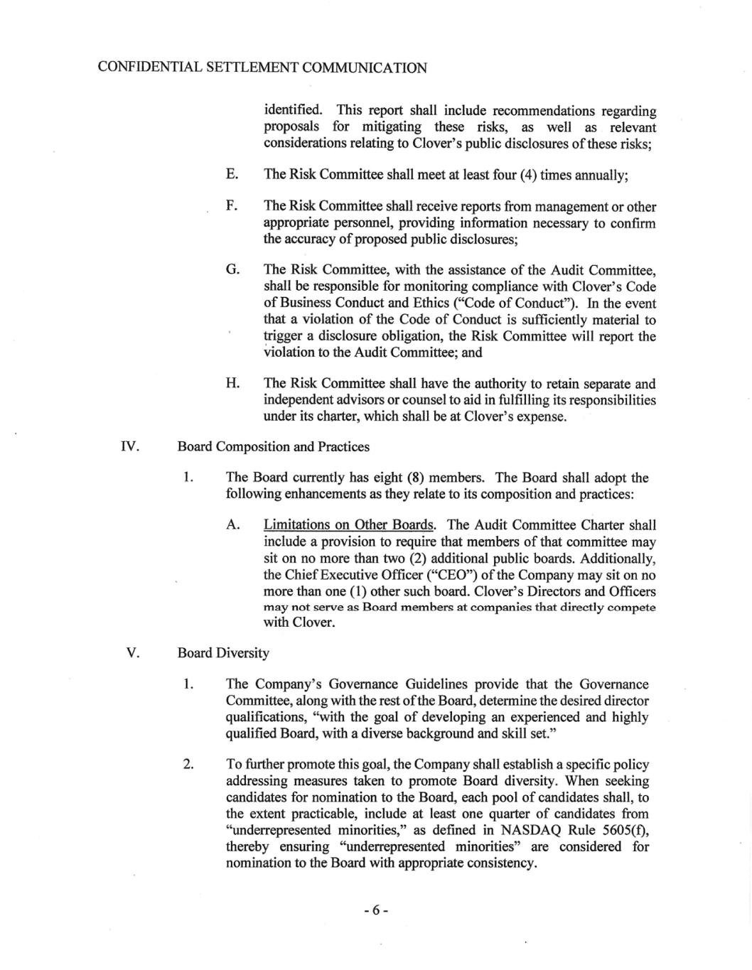 CONFIDENTIAL SETTLEMENT COMMUNICATION identified. This report shall include recommendations regarding proposals for mitigating these risks, as well as_ relevant considerations relating to Clover’s public disclosures of these risks; E. The Risk Committee shall meet at least four (4) times annually; F. The Risk Committee shall receive reports from management or other appropriate personnel, providing information necessary to confirm the accuracy of proposed public disclosures; G. The Risk Committee, with the assistance of the Audit Committee, shall be responsible for monitoring compliance with Clover’s Code of Business Conduct and Ethics (“Code of Conduct”). In the event that a violation of the Code of Conduct is sufficiently material to trigger a disclosure obligation, the Risk Committee will report the violation to the Audit Committee; and H. The Risk Committee shall have the authority to retain separate and independent advisors or counsel to aid in fulfilling its responsibilities under its charter, which shall be at Clover’s expense. IV. Board Composition and Practices 1. The Board currently has eight (8) members. The Board shall adopt the following enhancements as they relate to its composition and practices: A. Limitations on Other Boards. The Audit Committee Charter shall include a provision to require that members of that committee may sit on no more than two (2) additional public boards. Additionally, the Chief Executive Officer (“CEO”) of the Company may sit on no more than one (1) other such board. Clover’s Directors and Officers may not serve as Board members at companies that directly compete with Clover. V. Board Diversity 1. The Company’s Governance Guidelines provide that the Governance Committee, along with the rest of the Board, determine the desired director qualifications, “with the goal of developing an experienced and highly qualified Board, with a diverse background and skill set.” va To further promote this goal, the Company shall establish a specific policy addressing measures taken to promote Board diversity. When seeking candidates for nomination to the Board, each pool of candidates shall, to the extent practicable, include at least one quarter of candidates from “underrepresented minorities,” as defined in NASDAQ Rule 5605(f), thereby ensuring “underrepresented minorities” are considered for nomination to the Board with appropriate consistency. -6-