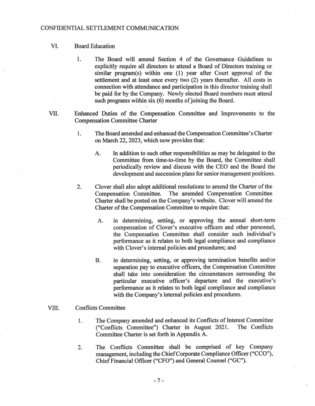 CONFIDENTIAL SETTLEMENT COMMUNICATION VI. Vil. Vit. Board Education 1. The Board will amend Section 4 of the Governance Guidelines to explicitly require all directors to attend a Board of Directors training or similar program(s) within one (1) year after Court approval of the settlement and at least once every two (2) years thereafter. All costs in connection with attendance and participation in this director training shall be paid for by the Company. Newly elected Board members must attend such programs within six (6) months of joining the Board. Enhanced Duties of the Compensation Committee and Improvements to the Compensation Committee Charter iF The Board amended and enhanced the Compensation Committee’s Charter on March 22, 2023, which now provides that: A. In addition to such other responsibilities as may be delegated to the Committee from time-to-time by the Board, the Committee shall periodically review and discuss with the CEO and the Board the development and succession plans for senior management positions. Clover shall also adopt additional resolutions to amend the Charter of the Compensation Committee. The amended Compensation Committee Charter shall be posted on the Company’s website. Clover will amend the Charter of the Compensation Committee to require that: A. in determining, setting, or approving the annual short-term compensation of Clover’s executive officers and other personnel, the Compensation Committee shall consider such individual’s performance as it relates to both legal compliance and compliance with Clover’s internal policies and procedures; and B. in determining, setting, or approving termination benefits and/or separation pay to executive officers, the Compensation Committee shall take into consideration the circumstances surrounding the particular executive officer’s departure and the executive’s performance as it relates to both legal compliance and compliance with the Company’s internal policies and procedures. Conflicts Committee L, The Company amended and enhanced its Conflicts of Interest Committee (“Conflicts Committee”) Charter in August 2021. The Conflicts Committee Charter is set forth in Appendix A. The Conflicts Committee shall be comprised of key Company management, including the Chief Corporate Compliance Officer (“CCO”), Chief Financial Officer (“CFO”) and General Counsel (“GC”). ie