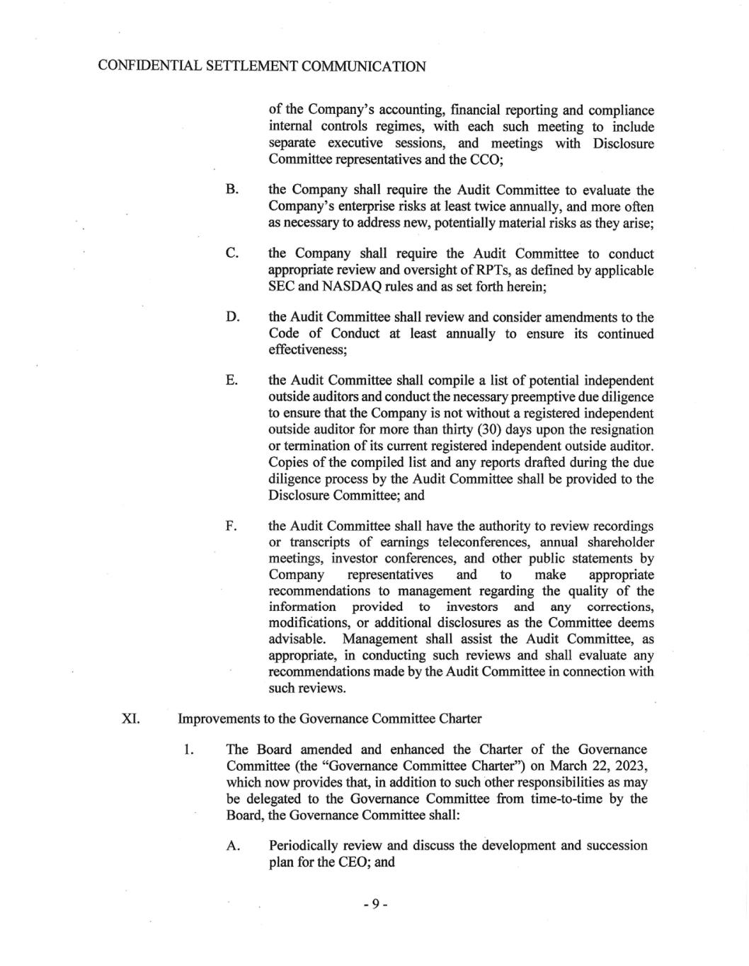 CONFIDENTIAL SETTLEMENT COMMUNICATION XI. of the Company’s accounting, financial reporting and compliance internal controls regimes, with each such meeting to include separate executive sessions, and meetings with Disclosure Committee representatives and the CCO; the Company shall require the Audit Committee to evaluate the Company’s enterprise risks at least twice annually, and more often as necessary to address new, potentially material risks as they arise; the Company shall require the Audit Committee to conduct appropriate review and oversight of RPTs, as defined by applicable SEC and NASDAQ rules and as set forth herein; the Audit Committee shall review and consider amendments to the Code of Conduct at least annually to ensure its continued effectiveness; the Audit Committee shall compile a list of potential independent outside auditors and conduct the necessary preemptive due diligence to ensure that the Company is not without a registered independent outside auditor for more than thirty (30) days upon the resignation or termination of its current registered independent outside auditor. Copies of the compiled list and any reports drafted during the due diligence process by the Audit Committee shall be provided to the Disclosure Committee; and the Audit Committee shall have the authority to review recordings or transcripts of earnings teleconferences, annual shareholder meetings, investor conferences, and other public statements by Company representatives and to make appropriate recommendations to management regarding the quality of the information provided to investors and any _ corrections, modifications, or additional disclosures as the Committee deems advisable. Management shall assist the Audit Committee, as appropriate, in conducting such reviews and shall evaluate any recommendations made by the Audit Committee in connection with such reviews. Improvements to the Governance Committee Charter 1. The Board amended and enhanced the Charter of the Governance Committee (the “Governance Committee Charter”) on March 22, 2023, which now provides that, in addition to such other responsibilities as may be delegated to the Governance Committee from time-to-time by the Board, the Governance Committee shall: Periodically review and discuss the development and succession plan for the CEO; and -9-