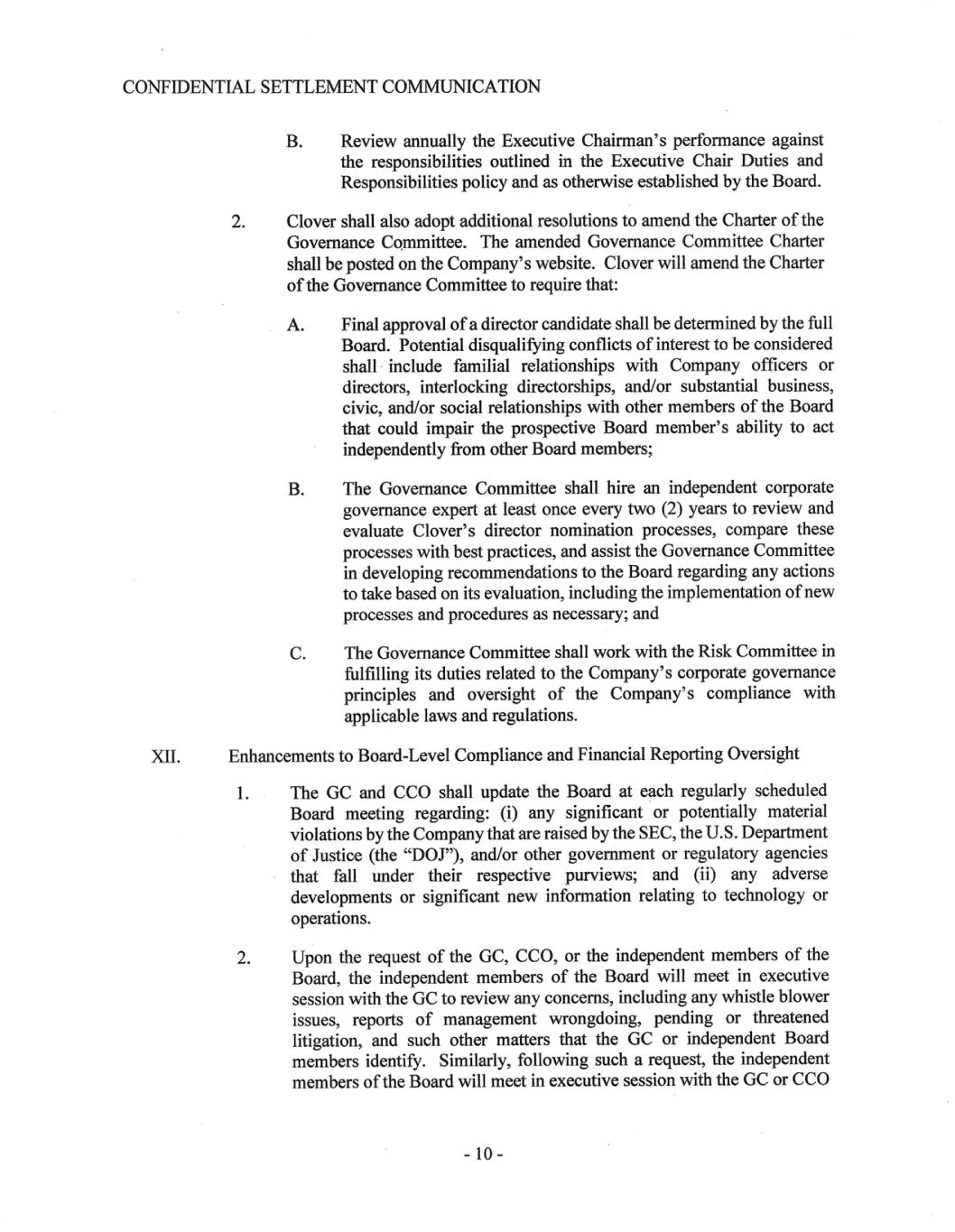 CONFIDENTIAL SETTLEMENT COMMUNICATION XII. B. Review annually the Executive Chairman’s performance against the responsibilities outlined in the Executive Chair Duties and Responsibilities policy and as otherwise established by the Board. Clover shall also adopt additional resolutions to amend the Charter of the Governance Committee. The amended Governance Committee Charter shall be posted on the Company’s website. Clover will amend the Charter of the Governance Committee to require that: A. Final approval of a director candidate shall be determined by the full Board. Potential disqualifying conflicts of interest to be considered shall: include familial relationships with Company officers or directors, interlocking directorships, and/or substantial business, civic, and/or social relationships with other members of the Board that could impair the prospective Board member’s ability to act independently from other Board members; B. The Governance Committee shall hire an independent corporate governance expert at least once every two (2) years to review and evaluate Clover’s director nomination processes, compare these processes with best practices, and assist the Governance Committee in developing recommendations to the Board regarding any actions to take based on its evaluation, including the implementation of new processes and procedures as necessary; and C. The Governance Committee shall work with the Risk Committee in fulfilling its duties related to the Company’s corporate governance principles and oversight of the Company’s compliance with applicable laws and regulations. Enhancements to Board-Level Compliance and Financial Reporting Oversight 1, The GC and CCO shall update the Board at each regularly scheduled Board meeting regarding: (i) any significant or potentially material violations by the Company that are raised by the SEC, the U.S. Department of Justice (the “DOJ”), and/or other government or regulatory agencies that fall under their respective purviews; and (ii) any adverse developments or significant new information relating to technology or operations. Upon the request of the GC, CCO, or the independent members of the Board, the independent members of the Board will meet in executive session with the GC to review any concerns, including any whistle blower issues, reports of management wrongdoing, pending or threatened litigation, and such other matters that the GC or independent Board members identify. Similarly, following such a request, the independent members of the Board will meet in executive session with the GC or CCO -10-