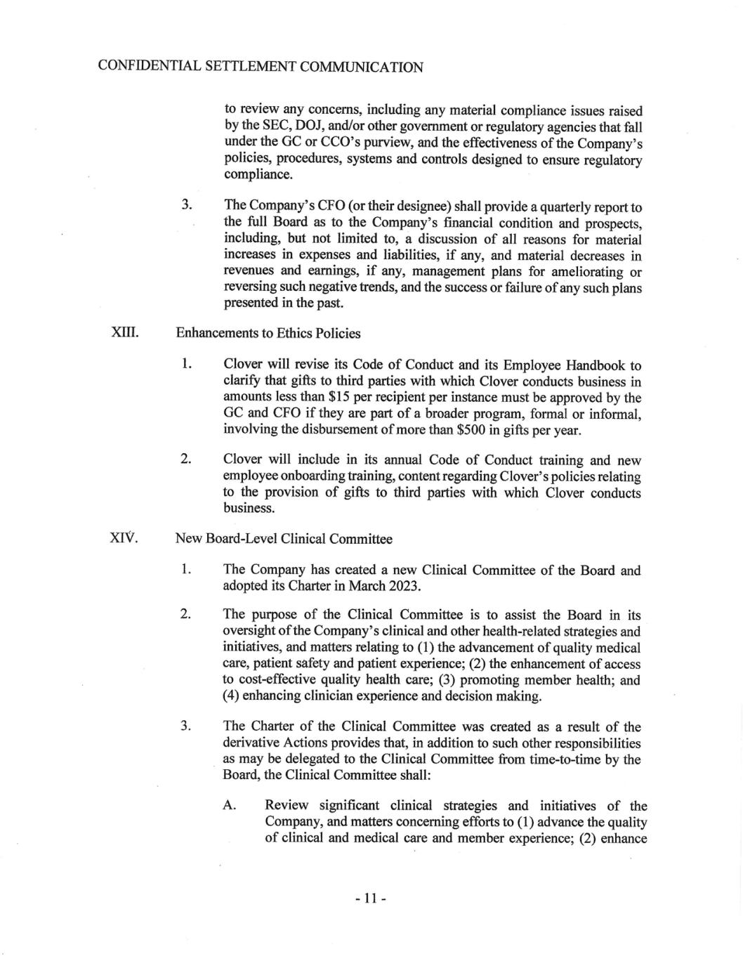 CONFIDENTIAL SETTLEMENT COMMUNICATION to review any concerns, including any material compliance issues raised by the SEC, DOJ, and/or other government or regulatory agencies that fall under the GC or CCO’s purview, and the effectiveness of the Company’s policies, procedures, systems and controls designed to ensure regulatory compliance. The Company’s CFO (or their designee) shall provide a quarterly report to the full Board as to the Company’s financial condition and prospects, including, but not limited to, a discussion of all reasons for material increases in expenses and liabilities, if any, and material decreases in revenues and earnings, if any, management plans for ameliorating or reversing such negative trends, and the success or failure of any such plans presented in the past. XIll. Enhancements to Ethics Policies be Clover will revise its Code of Conduct and its Employee Handbook to clarify that gifts to third parties with which Clover conducts business in amounts less than $15 per recipient per instance must be approved by the GC and CFO if they are part of a broader program, formal or informal, involving the disbursement of more than $500 in gifts per year. Clover will include in its annual Code of Conduct training and new employee onboarding training, content regarding Clover’s policies relating to the provision of gifts to third parties with which Clover conducts business. XIV. New Board-Level Clinical Committee iF The Company has created a new Clinical Committee of the Board and adopted its Charter in March 2023. The purpose of the Clinical Committee is to assist the Board in its oversight of the Company’s clinical and other health-related strategies and initiatives, and matters relating to (1) the advancement of quality medical care, patient safety and patient experience; (2) the enhancement of access to cost-effective quality health care; (3) promoting member health; and (4) enhancing clinician experience and decision making. The Charter of the Clinical Committee was created as a result of the derivative Actions provides that, in addition to such other responsibilities as may be delegated to the Clinical Committee from time-to-time by the Board, the Clinical Committee shall: A. Review significant clinical strategies and initiatives of the Company, and matters concerning efforts to (1) advance the quality of clinical and medical care and member experience; (2) enhance -ll-