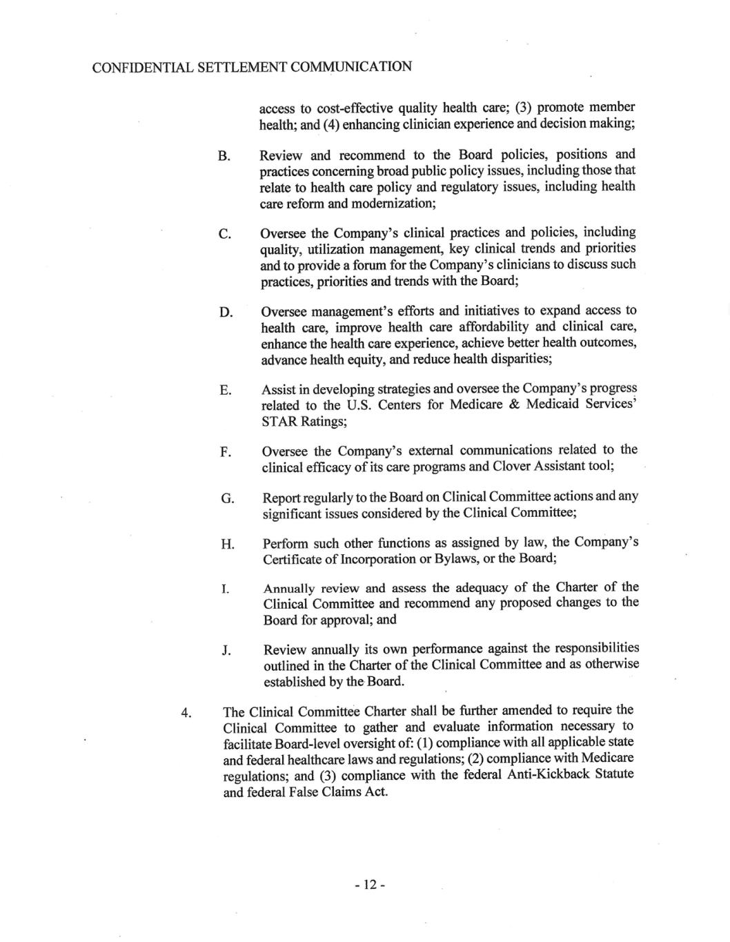 CONFIDENTIAL SETTLEMENT COMMUNICATION access to cost-effective quality health care; (3) promote member health; and (4) enhancing clinician experience and decision making; B. Review and recommend to the Board policies, positions and practices concerning broad public policy issues, including those that relate to health care policy and regulatory issues, including health care reform and modernization; c. Oversee the Company’s clinical practices and policies, including quality, utilization management, key clinical trends and priorities and to provide a forum for the Company’s clinicians to discuss such practices, priorities and trends with the Board; D. Oversee management’s efforts and initiatives to expand access to health care, improve health care affordability and clinical care, enhance the health care experience, achieve better health outcomes, advance health equity, and reduce health disparities; E. Assist in developing strategies and oversee the Company’s progress related to the U.S. Centers for Medicare & Medicaid Services’ STAR Ratings; F, Oversee the Company’s external communications related to the clinical efficacy of its care programs and Clover Assistant tool; G. Report regularly to the Board on Clinical Committee actions and any significant issues considered by the Clinical Committee; H. Perform such other functions as assigned by law, the Company’s Certificate of Incorporation or Bylaws, or the Board; I. Annually review and assess the adequacy of the Charter of the Clinical Committee and recommend any proposed changes to the Board for approval; and J. Review annually its own performance against the responsibilities outlined in the Charter of the Clinical Committee and as otherwise established by the Board. 4, The Clinical Committee Charter shall be further amended to require the Clinical Committee to gather and evaluate information necessary to facilitate Board-level oversight of: (1) compliance with all applicable state and federal healthcare laws and regulations; (2) compliance with Medicare regulations; and (3) compliance with the federal Anti-Kickback Statute and federal False Claims Act. -12-