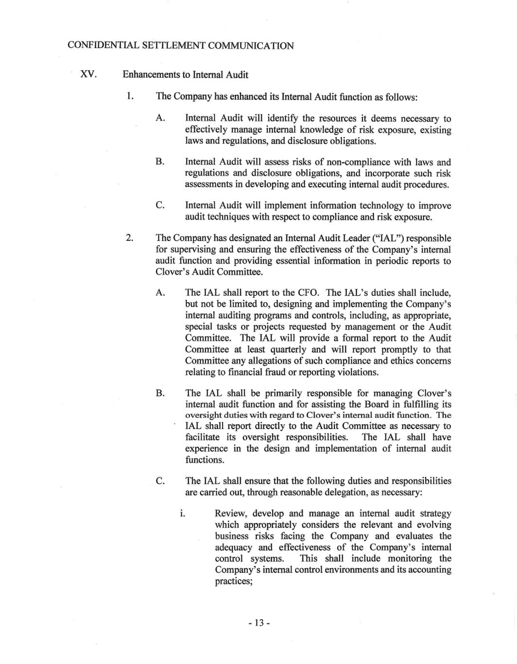 CONFIDENTIAL SETTLEMENT COMMUNICATION XV. Enhancements to Internal Audit 1. The Company has enhanced its Internal Audit function as follows: A. Internal Audit will identify the resources it deems necessary to effectively manage internal knowledge of risk exposure, existing laws and regulations, and disclosure obligations. Internal Audit will assess risks of non-compliance with laws and regulations and disclosure obligations, and incorporate such risk assessments in developing and executing internal audit procedures. Internal Audit will implement information technology to improve audit techniques with respect to compliance and risk exposure. The Company has designated an Internal Audit Leader (“IAL”) responsible for supervising and ensuring the effectiveness of the Company’s internal audit function and providing essential information in periodic reports to Clover’s Audit Committee. A. The IAL shall report to the CFO. The IAL’s duties shall include, but not be limited to, designing and implementing the Company’s internal auditing programs and controls, including, as appropriate, special tasks or projects requested by management or the Audit Committee. The JAL will provide a formal report to the Audit Committee at least quarterly and will report promptly to that Committee any allegations of such compliance and ethics concerns relating to financial fraud or reporting violations. The IAL shall be primarily responsible for managing Clover’s internal audit function and for assisting the Board in fulfilling its oversight duties with regard to Clover’s internal audit function. The IAL shall report directly to the Audit Committee as necessary to facilitate its oversight responsibilities. The IAL shall have experience in the design and implementation of internal audit functions. The IAL shall ensure that the following duties and responsibilities are carried out, through reasonable delegation, as necessary: Review, develop and manage an internal audit strategy which appropriately considers the relevant and evolving business risks facing the Company and evaluates the adequacy and effectiveness of the Company’s internal control systems. This shall include monitoring the Company’s internal control environments and its accounting practices; -13-