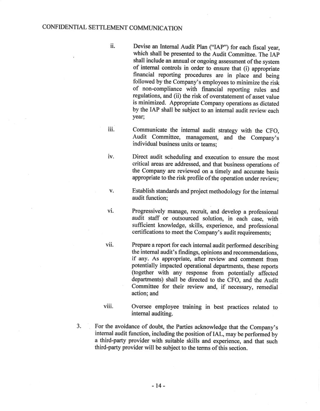 CONFIDENTIAL SETTLEMENT COMMUNICATION ii. ili. iv. Vi. Vil. Viii. Devise an Internal Audit Plan (“IAP”) for each fiscal year, which shall be presented to the Audit Committee. The IAP shall include an annual or ongoing assessment of the system of internal controls in order to ensure that (i) appropriate financial reporting procedures are in place and being followed by the Company’s employees to minimize the risk of non-compliance with financial reporting rules and regulations, and (ii) the risk of overstatement of asset value is minimized. Appropriate Company operations as dictated by the IAP shall be subject to an internal audit review each year; Communicate the internal audit strategy with the CFO, Audit Committee, management, and the Company’s individual business units or teams; Direct audit scheduling and execution to ensure the most critical areas are addressed, and that business operations of the Company are reviewed on a timely and accurate basis appropriate to the risk profile of the operation under review; Establish standards and project methodology for the internal audit function; Progressively manage, recruit, and develop a professional audit staff or outsourced solution, in each case, with sufficient knowledge, skills, experience, and professional certifications to meet the Company’s audit requirements; Prepare a report for each internal audit performed describing the internal audit’s findings, opinions and recommendations, if any. As appropriate, after review and comment from potentially impacted operational departments, these reports (together with any response from potentially affected departments) shall be directed to the CFO, and the Audit Committee for their review and, if necessary, remedial action; and Oversee employee training in best practices related to internal auditing. cf For the avoidance of doubt, the Parties acknowledge that the Company’s internal audit function, including the position of IAL, may be performed by a third-party provider with suitable skills and experience, and that such third-party provider will be subject to the terms of this section. wid
