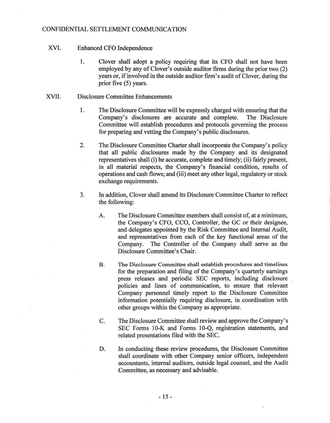 CONFIDENTIAL SETTLEMENT COMMUNICATION XVI. Enhanced CFO Independence L. Clover shall adopt a policy requiring that its CFO shall not have been employed by any of Clover’s outside auditor firms during the prior two (2) years or, if involved in the outside auditor firm’s audit of Clover, during the prior five (5) years. XVI. Disclosure Committee Enhancements 1. The Disclosure Committee will be expressly charged with ensuring that the Company’s disclosures are accurate and complete. The Disclosure Committee will establish procedures and protocols governing the process for preparing and vetting the Company’s public disclosures. The Disclosure Committee Charter shall incorporate the Company’s policy that all public disclosures made by the Company and its designated representatives shall (i) be accurate, complete and timely; (ii) fairly present, in all material respects, the Company’s financial condition, results of operations and cash flows; and (iii) meet any other legal, regulatory or stock exchange requirements. In addition, Clover shall amend its Disclosure Committee Charter to reflect the following: A. The Disclosure Committee members shall consist of, at a minimum, the Company’s CFO, CCO, Controller, the GC or their designee, and delegates appointed by the Risk Committee and Internal Audit, and representatives from each of the key functional areas of the Company. The Controller of the Company shall serve as the Disclosure Committee’s Chair. B. The Disclosure Committee shall establish procedures and timelines for the preparation and filing of the Company’s quarterly earnings press releases and periodic SEC reports, including disclosure — policies and lines of communication, to ensure that relevant Company personnel timely report to the Disclosure Committee information potentially requiring disclosure, in coordination with other groups within the Company as appropriate. Cc. The Disclosure Committee shall review and approve the Company’s SEC Forms 10-K and Forms 10-Q, registration statements, and related presentations filed with the SEC. D. In conducting these review procedures, the Disclosure Committee shall coordinate with other Company senior officers, independent accountants, internal auditors, outside legal counsel, and the Audit Committee, as necessary and advisable. -15-
