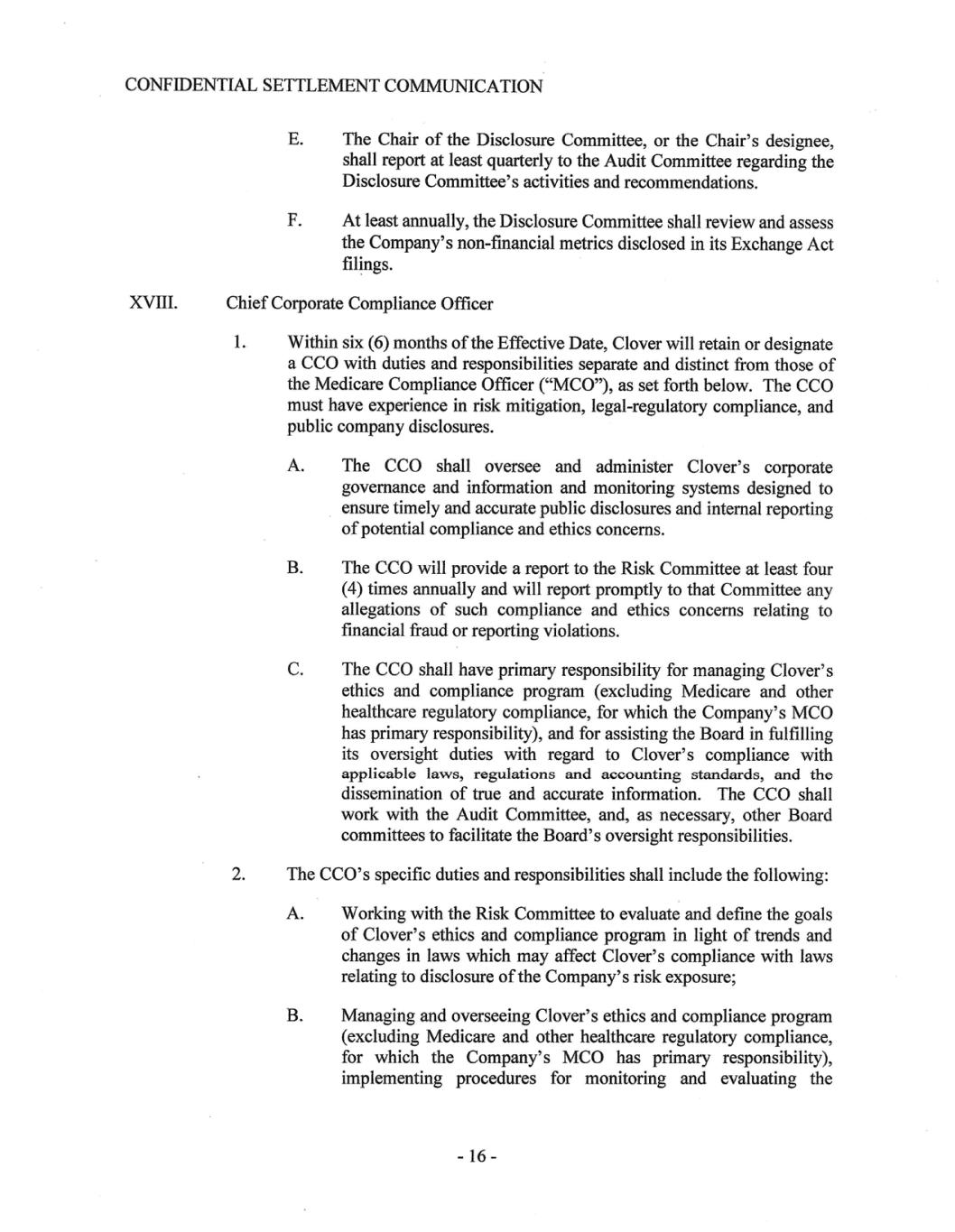 CONFIDENTIAL SETTLEMENT COMMUNICATION E. The Chair of the Disclosure Committee, or the Chair’s designee, shall report at least quarterly to the Audit Committee regarding the Disclosure Committee’s activities and recommendations. F, At least annually, the Disclosure Committee shall review and assess the Company’s non-financial metrics disclosed in its Exchange Act filings. XVIII. Chief Corporate Compliance Officer L. Within six (6) months of the Effective Date, Clover will retain or designate a CCO with duties and responsibilities separate and distinct from those of the Medicare Compliance Officer (“MCO”), as set forth below. The CCO must have experience in risk mitigation, legal-regulatory compliance, and public company disclosures. A. The CCO shall oversee and administer Clover’s corporate governance and information and monitoring systems designed to ensure timely and accurate public disclosures and internal reporting of potential compliance and ethics concerns. The CCO will provide a report to the Risk Committee at least four (4) times annually and will report promptly to that Committee any allegations of such compliance and ethics concerns relating to financial fraud or reporting violations. The CCO shall have primary responsibility for managing Clover’s ethics and compliance program (excluding Medicare and other healthcare regulatory compliance, for which the Company’s MCO has primary responsibility), and for assisting the Board in fulfilling its oversight duties with regard to Clover’s compliance with applicable laws, regulations and accounting standards, and the dissemination of true and accurate information. The CCO shall work with the Audit Committee, and, as necessary, other Board committees to facilitate the Board’s oversight responsibilities. 2. The CCO’s specific duties and responsibilities shall include the following: A. Working with the Risk Committee to evaluate and define the goals of Clover’s ethics and compliance program in light of trends and changes in laws which may affect Clover’s compliance with laws relating to disclosure of the Company’s risk exposure; Managing and overseeing Clover’s ethics and compliance program (excluding Medicare and other healthcare regulatory compliance, for which the Company’s MCO has primary responsibility), implementing procedures for monitoring and evaluating the -16-
