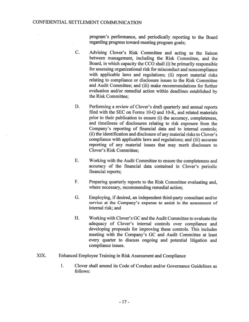 CONFIDENTIAL SETTLEMENT COMMUNICATION program’s performance, and periodically reporting to the Board regarding progress toward meeting program goals; Cc. Advising Clover’s Risk Committee and acting as the liaison between management, including the Risk Committee, and the Board, in which capacity the CCO shall (i) be primarily responsible for assessing organizational risk for misconduct and noncompliance with applicable laws and regulations; (ii) report material risks relating to compliance or disclosure issues to the Risk Committee and Audit Committee; and (iii) make recommendations for further evaluation and/or remedial action within deadlines established by the Risk Committee; D, Performing a review of Clover’s draft quarterly and annual reports filed with the SEC on Forms 10-Q and 10-K, and related materials prior to their publication to ensure (i) the accuracy, completeness, and timeliness of disclosures relating to risk exposure from the Company’s reporting of financial data and to internal controls; (ii) the identification and disclosure of any material risks to Clover’s compliance with applicable laws and regulations; and (iii) accurate reporting of any material issues that may merit disclosure to Clover’s Risk Committee; E, Working with the Audit Committee to ensure the completeness and accuracy of the financial data contained in Clover’s periodic financial reports; F. Preparing quarterly reports to the Risk Committee evaluating and, where necessary, recommending remedial action; G. Employing, if desired, an independent third-party consultant and/or service at the Company’s expense to assist in the assessment of internal risk; and H. Working with Clover’s GC and the Audit Committee to evaluate the adequacy of Clover’s internal controls over compliance and developing proposals for improving these controls. This includes meeting with the Company’s GC and Audit Committee at least every quarter to discuss ongoing and potential litigation and compliance issues. XIX. Enhanced Employee Training in Risk Assessment and Compliance 1. Clover shall amend its Code of Conduct and/or Governance Guidelines as follows: «17.