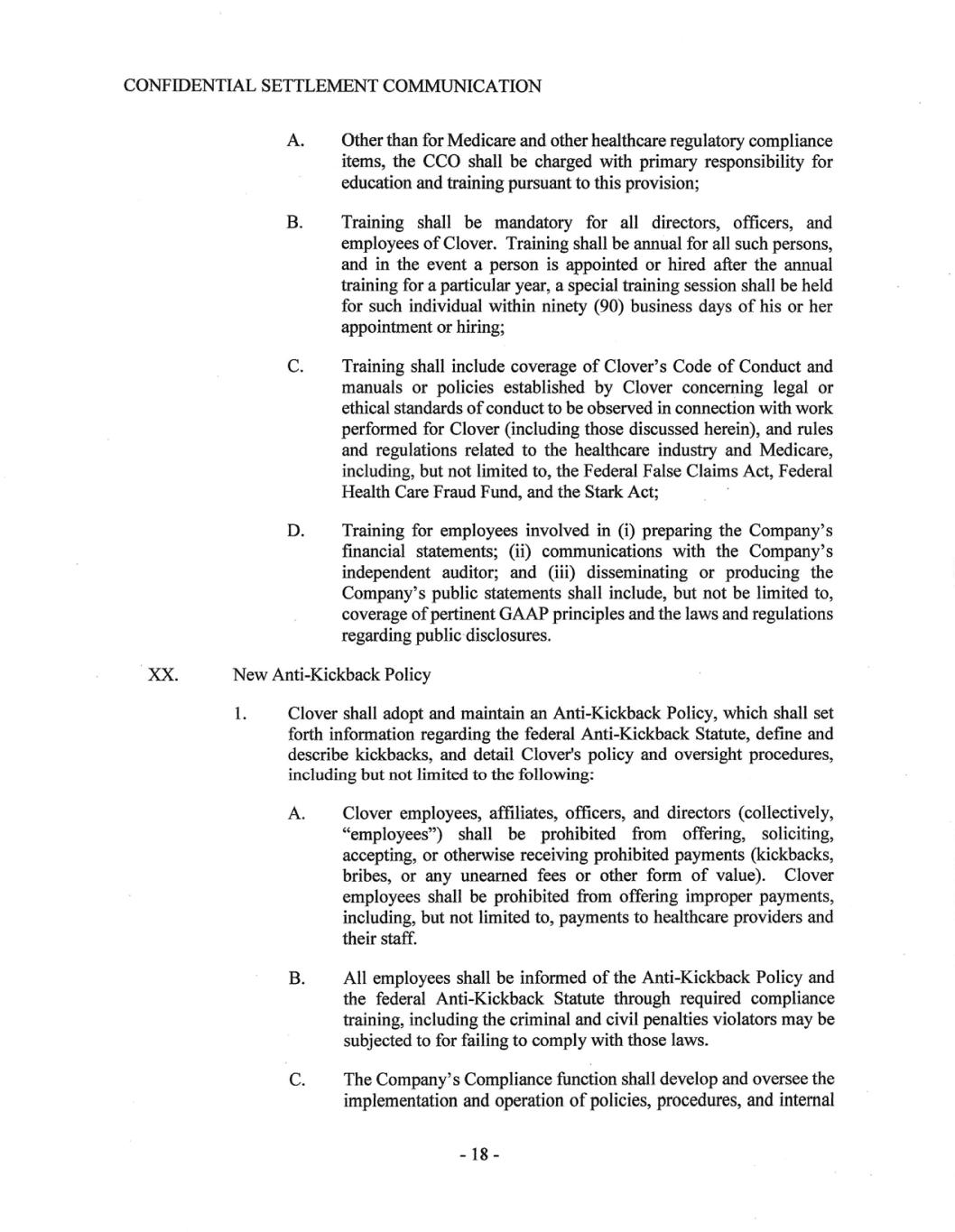 CONFIDENTIAL SETTLEMENT COMMUNICATION A. Other than for Medicare and other healthcare regulatory compliance items, the CCO shall be charged with primary responsibility for education and training pursuant to this provision; Training shall be mandatory for all directors, officers, and employees of Clover. Training shall be annual for all such persons, and in the event a person is appointed or hired after the annual training for a particular year, a special training session shall be held for such individual within ninety (90) business days of his or her appointment or hiring; Training shall include coverage of Clover’s Code of Conduct and manuals or policies established by Clover concerning legal or ethical standards of conduct to be observed in connection with work performed for Clover (including those discussed herein), and rules and regulations related to the healthcare industry and Medicare, including, but not limited to, the Federal False Claims Act, Federal Health Care Fraud Fund, and the Stark Act; Training for employees involved in (i) preparing the Company’s financial statements; (ii) communications with the Company’s independent auditor; and (iii) disseminating or producing the Company’s public statements shall include, but not be limited to, coverage of pertinent GAAP principles and the laws and regulations regarding public disclosures. XX. New Anti-Kickback Policy 1. Clover shall adopt and maintain an Anti-Kickback Policy, which shall set forth information regarding the federal Anti-Kickback Statute, define and describe kickbacks, and detail Clover's policy and oversight procedures, including but not limited to the following: A. Clover employees, affiliates, officers, and directors (collectively, “employees”) shall be prohibited from offering, soliciting, accepting, or otherwise receiving prohibited payments (kickbacks, bribes, or any unearned fees or other form of value). Clover employees shall be prohibited from offering improper payments, including, but not limited to, payments to healthcare providers and their staff. All employees shall be informed of the Anti-Kickback Policy and the federal Anti-Kickback Statute through required compliance training, including the criminal and civil penalties violators may be subjected to for failing to comply with those laws. The Company’s Compliance function shall develop and oversee the implementation and operation of policies, procedures, and internal -18-