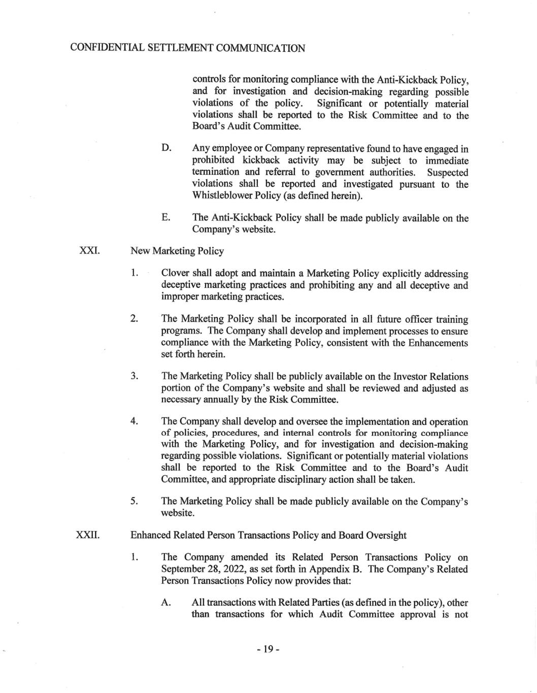 CONFIDENTIAL SETTLEMENT COMMUNICATION XXII. controls for monitoring compliance with the Anti-Kickback Policy, and for investigation and decision-making regarding possible violations of the policy. Significant or potentially material violations shall be reported to the Risk Committee and to the Board’s Audit Committee. D. Any employee or Company representative found to have engaged in prohibited kickback activity may be subject to immediate termination and referral to government authorities. Suspected violations shall be reported and investigated pursuant to the Whistleblower Policy (as defined herein). E, The Anti-Kickback Policy shall be made publicly available on the Company’s website. New Marketing Policy 1. Clover shall adopt and maintain a Marketing Policy explicitly addressing deceptive marketing practices and prohibiting any and all deceptive and improper marketing practices. Zz. The Marketing Policy shall be incorporated in all future officer training programs. The Company shall develop and implement processes to ensure compliance with the Marketing Policy, consistent with the Enhancements set forth herein. 3. The Marketing Policy shall be publicly available on the Investor Relations portion of the Company’s website and shall be reviewed and adjusted as necessary annually by the Risk Committee. 4. The Company shall develop and oversee the implementation and operation of policies, procedures, and internal controls for monitoring compliance with the Marketing Policy, and for investigation and decision-making regarding possible violations. Significant or potentially material violations shall be reported to the Risk Committee and to the Board’s Audit Committee, and appropriate disciplinary action shall be taken. 5: The Marketing Policy shall be made publicly available on the Company’s website. Enhanced Related Person Transactions Policy and Board Oversight I. The Company amended its Related Person Transactions Policy on September 28, 2022, as set forth in Appendix B. The Company’s Related Person Transactions Policy now provides that: A. All transactions with Related Parties (as defined in the policy), other than transactions for which Audit Committee approval is not -19-