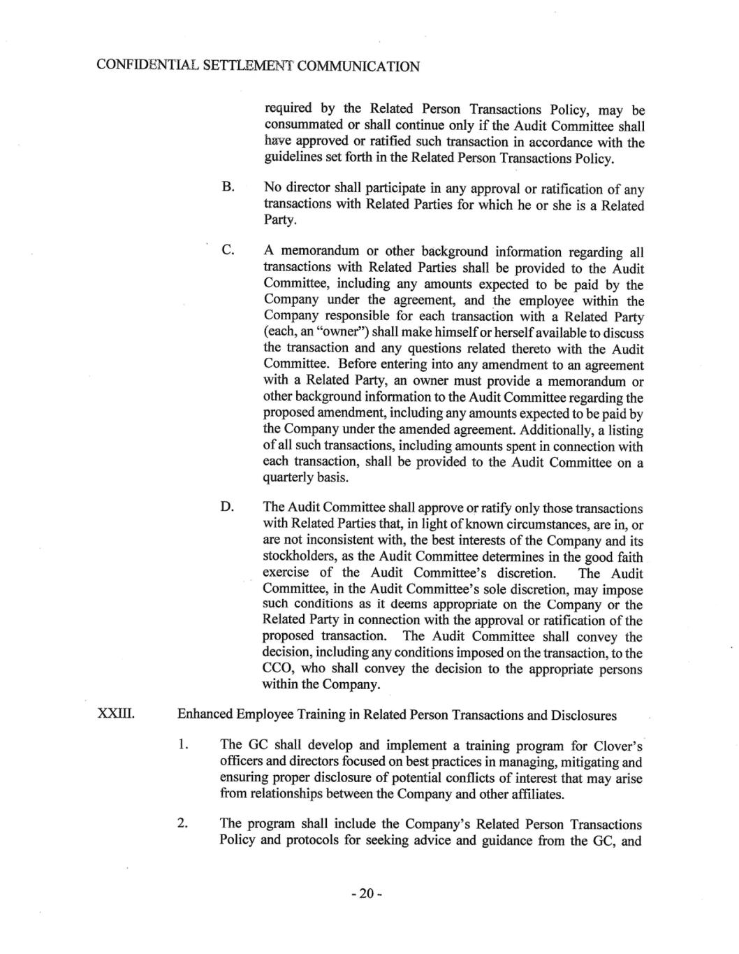 CONFIDENTIAL SETTLEMENT COMMUNICATION The Conflicts Committee has general oversight responsibility for the implementation, supervision, and ongoing management of the Company’s conflicts of interest program, policies, and procedures; the determination of whether particular relationships or related party transactions (“RPTs”) constitute actual or potential conflicts of interest; the determination and implementation of any mitigating steps in response to any such conflicts; and the determination of whether any relationships or conflicts should be escalated for review to the Audit Committee. The Conflicts Committee shall implement and maintain a Conflicts of Interest policy and procedure (the “Conflicts of Interest Policy”) that ensures that the Company complies with industry standards and best practices for public companies. The Conflicts of Interest Policy shall include detailed procedures and thresholds for identification, evaluation, and decision-making regarding existing or proposed RPTs involving Section 16 reporting officers or directors that pose a risk of an actual or potential conflict of interest. The Conflicts Committee shall, on no less than an annual basis, review and amend the Conflicts of Interest Policy and related procedures as the Conflicts Committee and Audit Committee deem necessary and appropriate to ensure its continued effectiveness. The Conflicts Committee Chair and the Conflicts Committee shall report directly to and shall be accountable to Clover’s Audit Committee. Reports to the Audit Committee will address activities and the status of the conflicts program, including any identified, investigated and/or resolved significant or material issues, and the results of internal and external audits. The Conflicts Committee will meet at least monthly, and as frequently as necessary to ensure effective oversight of the conflicts program. IX. Enhanced Duties of the Audit Committee 1. The Audit Committee shall meet at least four (4) times annually and in separate executive sessions with representatives of the Company’s management-level Disclosure Committee and CCO in carrying out its duties. X. Audit Committee Charter Enhancements 1. Clover shall adopt a resolution to amend the Charter of the Audit Committee (the “Audit Committee Charter”). The amended Audit Committee Charter shall be posted on the Company’s website. The amended Audit Committee Charter shall provide that: A. the Audit Committee shall meet at least five (5) times annually, including one meeting focused exclusively on ERM and assessment -8-