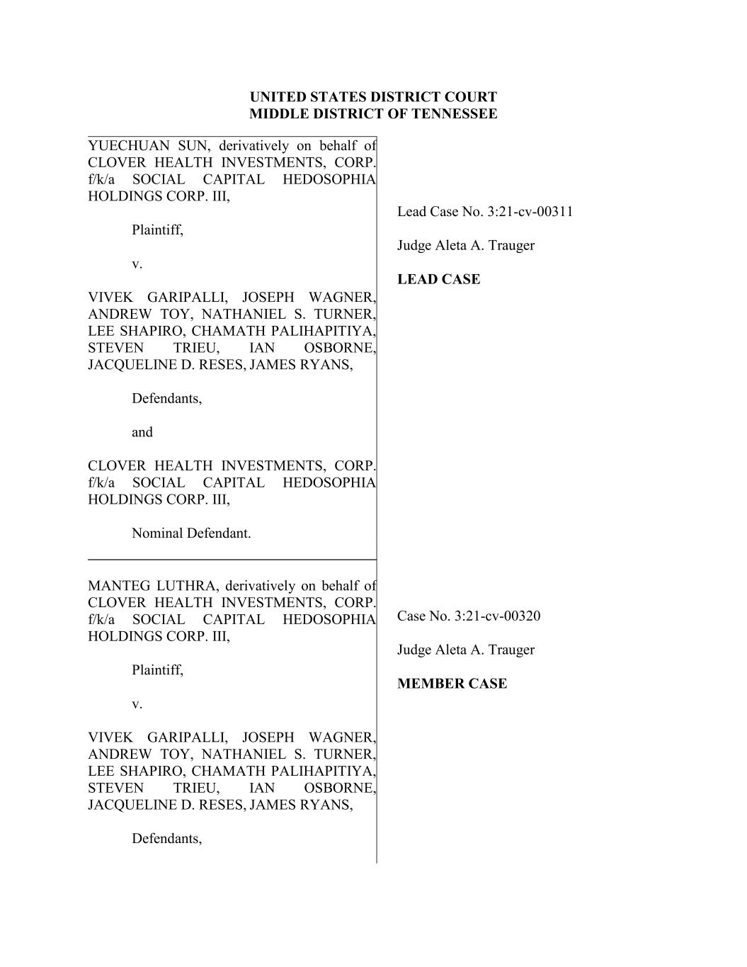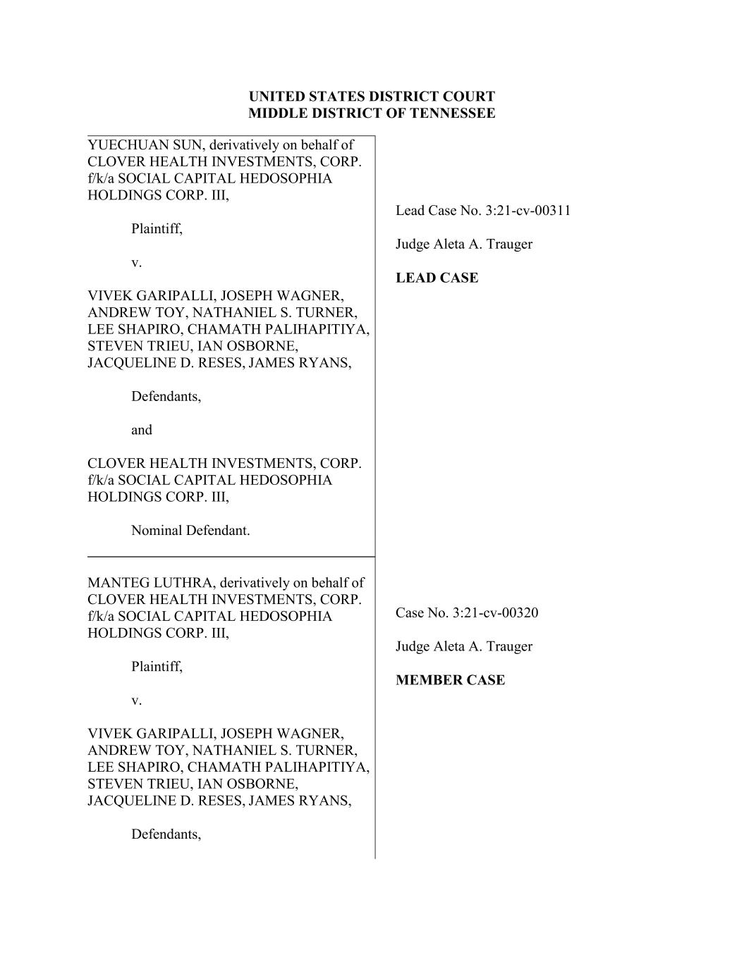 UNITED STATES DISTRICT COURT MIDDLE DISTRICT OF TENNESSEE YUECHUAN SUN, derivatively on behalf of CLOVER HEALTH INVESTMENTS, CORP. f/k/a SOCIAL CAPITAL HEDOSOPHIA HOLDINGS CORP. III, Plaintiff, v. VIVEK GARIPALLI, JOSEPH WAGNER, ANDREW TOY, NATHANIEL S. TURNER, LEE SHAPIRO, CHAMATH PALIHAPITIYA, STEVEN TRIEU, IAN OSBORNE, JACQUELINE D. RESES, JAMES RYANS, Defendants, and CLOVER HEALTH INVESTMENTS, CORP. f/k/a SOCIAL CAPITAL HEDOSOPHIA HOLDINGS CORP. III, Nominal Defendant. Lead Case No. 3:21-cv-00311 Judge Aleta A. Trauger LEAD CASE MANTEG LUTHRA, derivatively on behalf of CLOVER HEALTH INVESTMENTS, CORP. f/k/a SOCIAL CAPITAL HEDOSOPHIA HOLDINGS CORP. III, Plaintiff, v. VIVEK GARIPALLI, JOSEPH WAGNER, ANDREW TOY, NATHANIEL S. TURNER, LEE SHAPIRO, CHAMATH PALIHAPITIYA, STEVEN TRIEU, IAN OSBORNE, JACQUELINE D. RESES, JAMES RYANS, Defendants, Case No. 3:21-cv-00320 Judge Aleta A. Trauger MEMBER CASE
