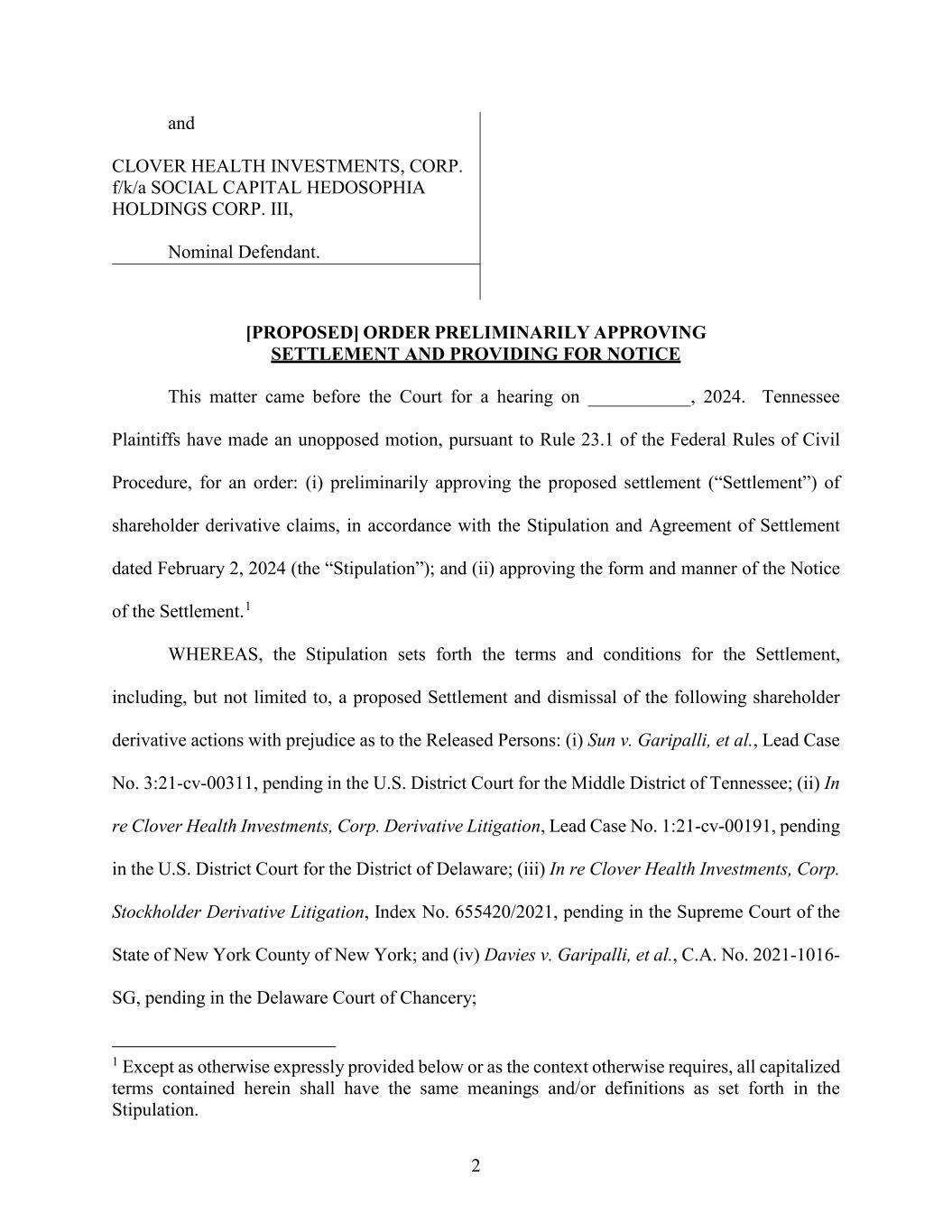 2 and CLOVER HEALTH INVESTMENTS, CORP. f/k/a SOCIAL CAPITAL HEDOSOPHIA HOLDINGS CORP. III, Nominal Defendant. [PROPOSED] ORDER PRELIMINARILY APPROVING SETTLEMENT AND PROVIDING FOR NOTICE This matter came before the Court for a hearing on ___________, 2024. Tennessee Plaintiffs have made an unopposed motion, pursuant to Rule 23.1 of the Federal Rules of Civil Procedure, for an order: (i) preliminarily approving the proposed settlement (“Settlement”) of shareholder derivative claims, in accordance with the Stipulation and Agreement of Settlement dated February 2, 2024 (the “Stipulation”); and (ii) approving the form and manner of the Notice of the Settlement.1 WHEREAS, the Stipulation sets forth the terms and conditions for the Settlement, including, but not limited to, a proposed Settlement and dismissal of the following shareholder derivative actions with prejudice as to the Released Persons: (i) Sun v. Garipalli, et al., Lead Case No. 3:21-cv-00311, pending in the U.S. District Court for the Middle District of Tennessee; (ii) In re Clover Health Investments, Corp. Derivative Litigation, Lead Case No. 1:21-cv-00191, pending in the U.S. District Court for the District of Delaware; (iii) In re Clover Health Investments, Corp. Stockholder Derivative Litigation, Index No. 655420/2021, pending in the Supreme Court of the State of New York County of New York; and (iv) Davies v. Garipalli, et al., C.A. No. 2021-1016- SG, pending in the Delaware Court of Chancery; 1 Except as otherwise expressly provided below or as the context otherwise requires, all capitalized terms contained herein shall have the same meanings and/or definitions as set forth in the Stipulation.