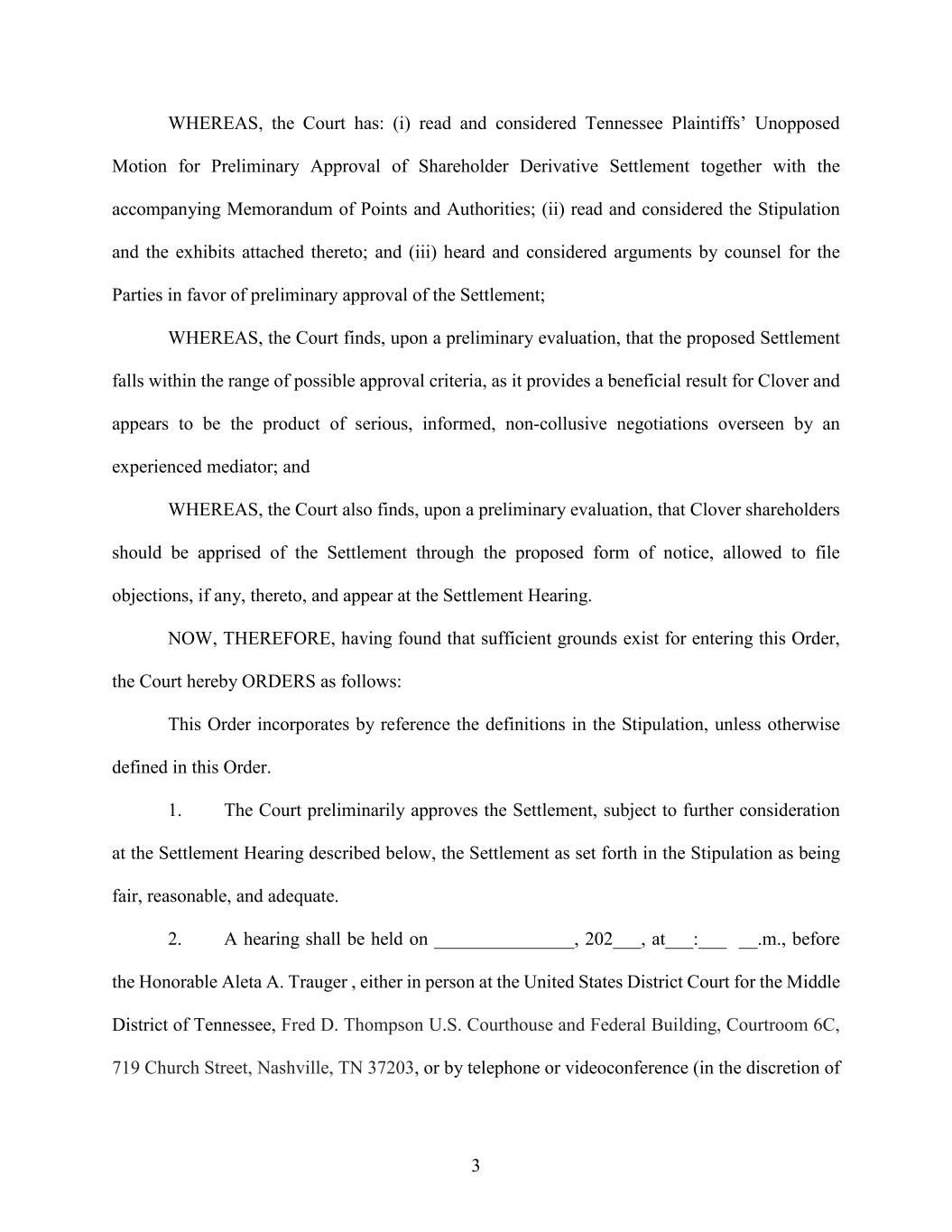 3 WHEREAS, the Court has: (i) read and considered Tennessee Plaintiffs’ Unopposed Motion for Preliminary Approval of Shareholder Derivative Settlement together with the accompanying Memorandum of Points and Authorities; (ii) read and considered the Stipulation and the exhibits attached thereto; and (iii) heard and considered arguments by counsel for the Parties in favor of preliminary approval of the Settlement; WHEREAS, the Court finds, upon a preliminary evaluation, that the proposed Settlement falls within the range of possible approval criteria, as it provides a beneficial result for Clover and appears to be the product of serious, informed, non-collusive negotiations overseen by an experienced mediator; and WHEREAS, the Court also finds, upon a preliminary evaluation, that Clover shareholders should be apprised of the Settlement through the proposed form of notice, allowed to file objections, if any, thereto, and appear at the Settlement Hearing. NOW, THEREFORE, having found that sufficient grounds exist for entering this Order, the Court hereby ORDERS as follows: This Order incorporates by reference the definitions in the Stipulation, unless otherwise defined in this Order. 1. The Court preliminarily approves the Settlement, subject to further consideration at the Settlement Hearing described below, the Settlement as set forth in the Stipulation as being fair, reasonable, and adequate. 2. A hearing shall be held on _______________, 202___, at___:___ __.m., before the Honorable Aleta A. Trauger , either in person at the United States District Court for the Middle District of Tennessee, Fred D. Thompson U.S. Courthouse and Federal Building, Courtroom 6C, 719 Church Street, Nashville, TN 37203, or by telephone or videoconference (in the discretion of