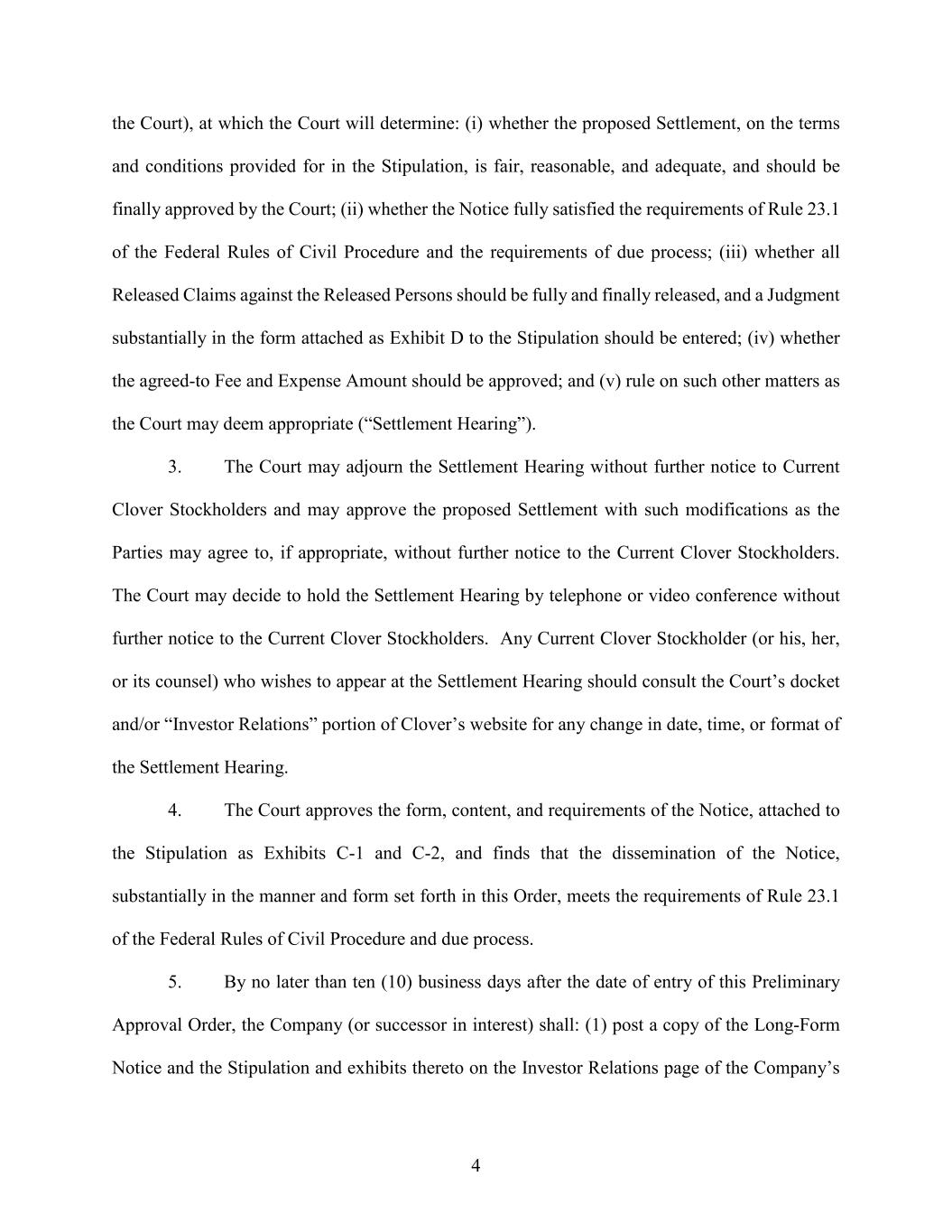 4 the Court), at which the Court will determine: (i) whether the proposed Settlement, on the terms and conditions provided for in the Stipulation, is fair, reasonable, and adequate, and should be finally approved by the Court; (ii) whether the Notice fully satisfied the requirements of Rule 23.1 of the Federal Rules of Civil Procedure and the requirements of due process; (iii) whether all Released Claims against the Released Persons should be fully and finally released, and a Judgment substantially in the form attached as Exhibit D to the Stipulation should be entered; (iv) whether the agreed-to Fee and Expense Amount should be approved; and (v) rule on such other matters as the Court may deem appropriate (“Settlement Hearing”). 3. The Court may adjourn the Settlement Hearing without further notice to Current Clover Stockholders and may approve the proposed Settlement with such modifications as the Parties may agree to, if appropriate, without further notice to the Current Clover Stockholders. The Court may decide to hold the Settlement Hearing by telephone or video conference without further notice to the Current Clover Stockholders. Any Current Clover Stockholder (or his, her, or its counsel) who wishes to appear at the Settlement Hearing should consult the Court’s docket and/or “Investor Relations” portion of Clover’s website for any change in date, time, or format of the Settlement Hearing. 4. The Court approves the form, content, and requirements of the Notice, attached to the Stipulation as Exhibits C-1 and C-2, and finds that the dissemination of the Notice, substantially in the manner and form set forth in this Order, meets the requirements of Rule 23.1 of the Federal Rules of Civil Procedure and due process. 5. By no later than ten (10) business days after the date of entry of this Preliminary Approval Order, the Company (or successor in interest) shall: (1) post a copy of the Long-Form Notice and the Stipulation and exhibits thereto on the Investor Relations page of the Company’s