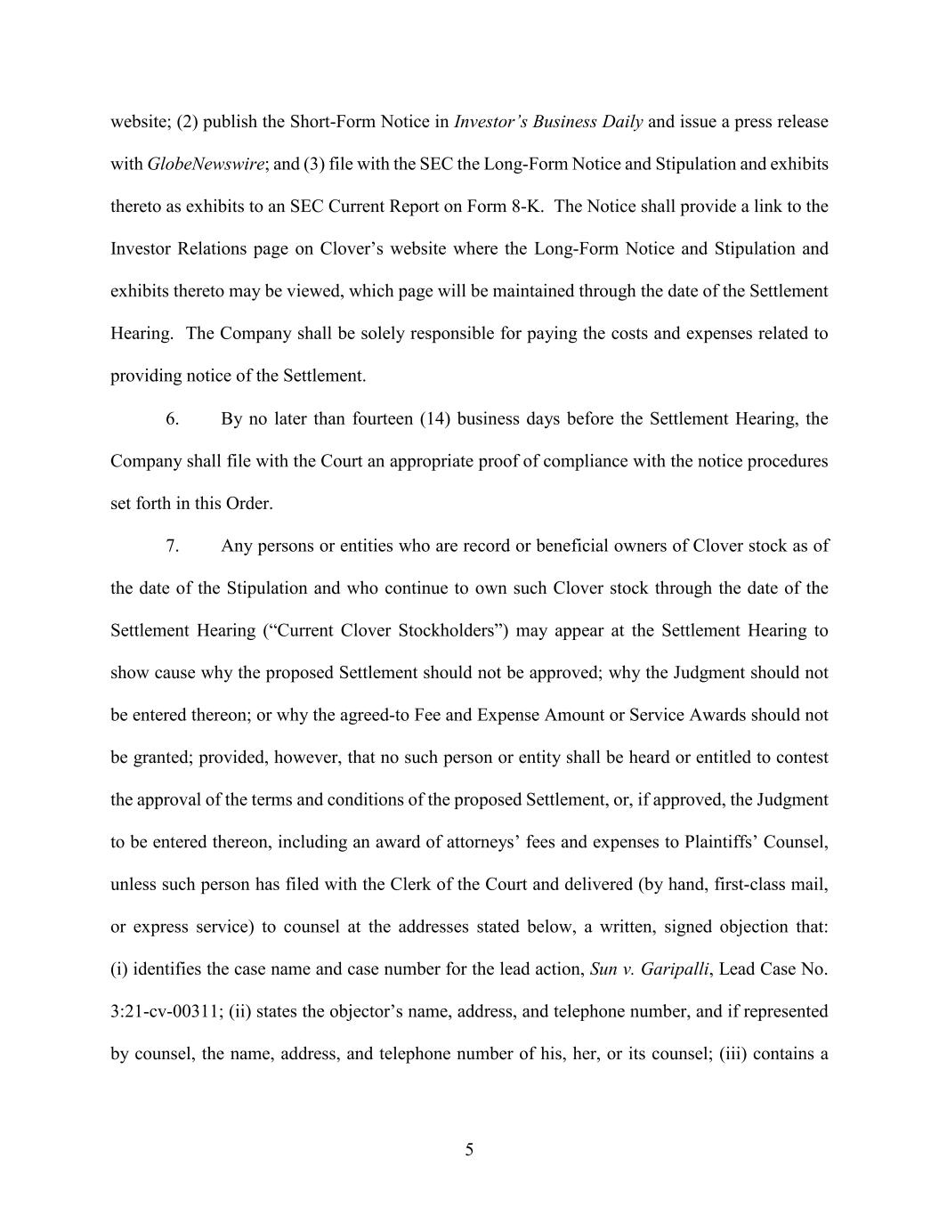 5 website; (2) publish the Short-Form Notice in Investor’s Business Daily and issue a press release with GlobeNewswire; and (3) file with the SEC the Long-Form Notice and Stipulation and exhibits thereto as exhibits to an SEC Current Report on Form 8-K. The Notice shall provide a link to the Investor Relations page on Clover’s website where the Long-Form Notice and Stipulation and exhibits thereto may be viewed, which page will be maintained through the date of the Settlement Hearing. The Company shall be solely responsible for paying the costs and expenses related to providing notice of the Settlement. 6. By no later than fourteen (14) business days before the Settlement Hearing, the Company shall file with the Court an appropriate proof of compliance with the notice procedures set forth in this Order. 7. Any persons or entities who are record or beneficial owners of Clover stock as of the date of the Stipulation and who continue to own such Clover stock through the date of the Settlement Hearing (“Current Clover Stockholders”) may appear at the Settlement Hearing to show cause why the proposed Settlement should not be approved; why the Judgment should not be entered thereon; or why the agreed-to Fee and Expense Amount or Service Awards should not be granted; provided, however, that no such person or entity shall be heard or entitled to contest the approval of the terms and conditions of the proposed Settlement, or, if approved, the Judgment to be entered thereon, including an award of attorneys’ fees and expenses to Plaintiffs’ Counsel, unless such person has filed with the Clerk of the Court and delivered (by hand, first-class mail, or express service) to counsel at the addresses stated below, a written, signed objection that: (i) identifies the case name and case number for the lead action, Sun v. Garipalli, Lead Case No. 3:21-cv-00311; (ii) states the objector’s name, address, and telephone number, and if represented by counsel, the name, address, and telephone number of his, her, or its counsel; (iii) contains a