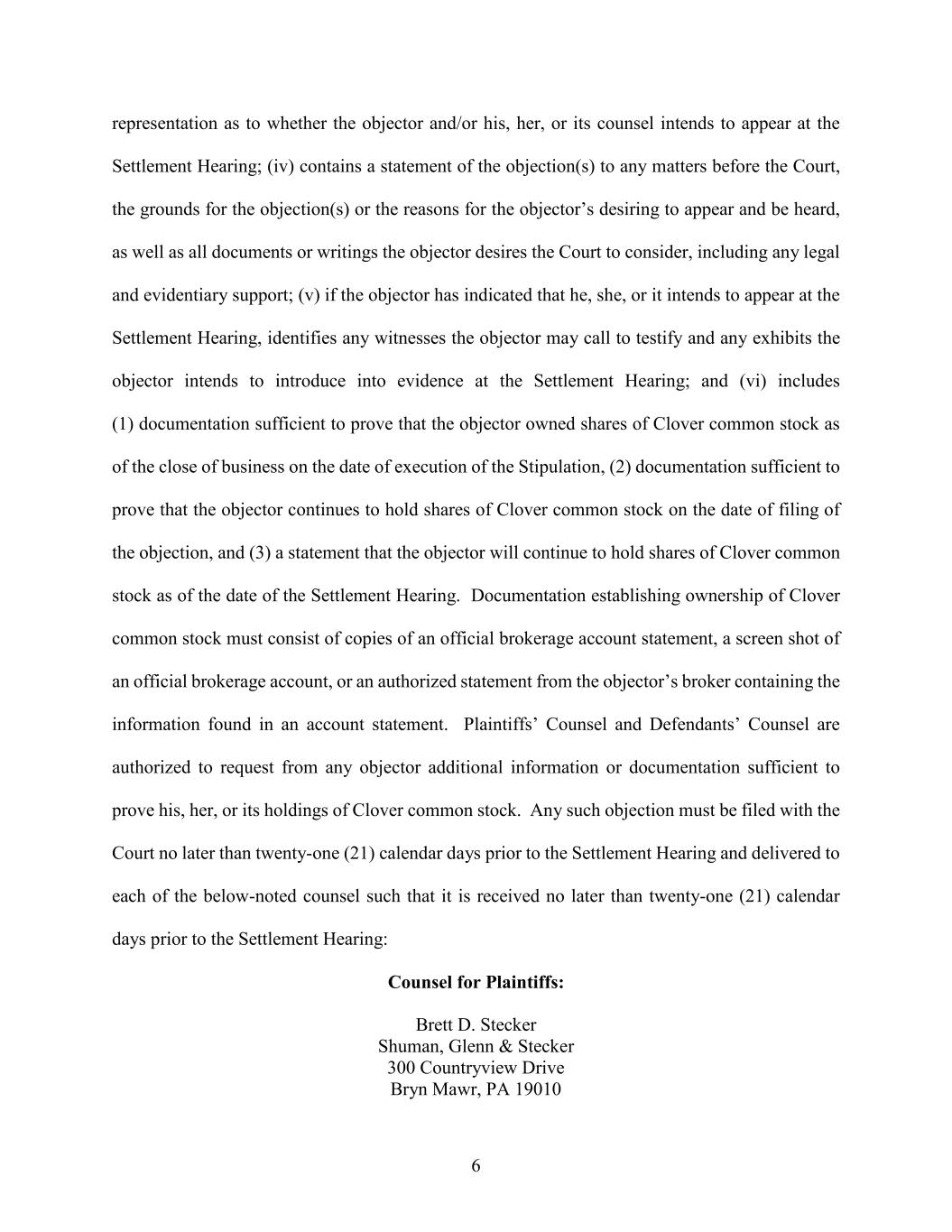 6 representation as to whether the objector and/or his, her, or its counsel intends to appear at the Settlement Hearing; (iv) contains a statement of the objection(s) to any matters before the Court, the grounds for the objection(s) or the reasons for the objector’s desiring to appear and be heard, as well as all documents or writings the objector desires the Court to consider, including any legal and evidentiary support; (v) if the objector has indicated that he, she, or it intends to appear at the Settlement Hearing, identifies any witnesses the objector may call to testify and any exhibits the objector intends to introduce into evidence at the Settlement Hearing; and (vi) includes (1) documentation sufficient to prove that the objector owned shares of Clover common stock as of the close of business on the date of execution of the Stipulation, (2) documentation sufficient to prove that the objector continues to hold shares of Clover common stock on the date of filing of the objection, and (3) a statement that the objector will continue to hold shares of Clover common stock as of the date of the Settlement Hearing. Documentation establishing ownership of Clover common stock must consist of copies of an official brokerage account statement, a screen shot of an official brokerage account, or an authorized statement from the objector’s broker containing the information found in an account statement. Plaintiffs’ Counsel and Defendants’ Counsel are authorized to request from any objector additional information or documentation sufficient to prove his, her, or its holdings of Clover common stock. Any such objection must be filed with the Court no later than twenty-one (21) calendar days prior to the Settlement Hearing and delivered to each of the below-noted counsel such that it is received no later than twenty-one (21) calendar days prior to the Settlement Hearing: Counsel for Plaintiffs: Brett D. Stecker Shuman, Glenn & Stecker 300 Countryview Drive Bryn Mawr, PA 19010
