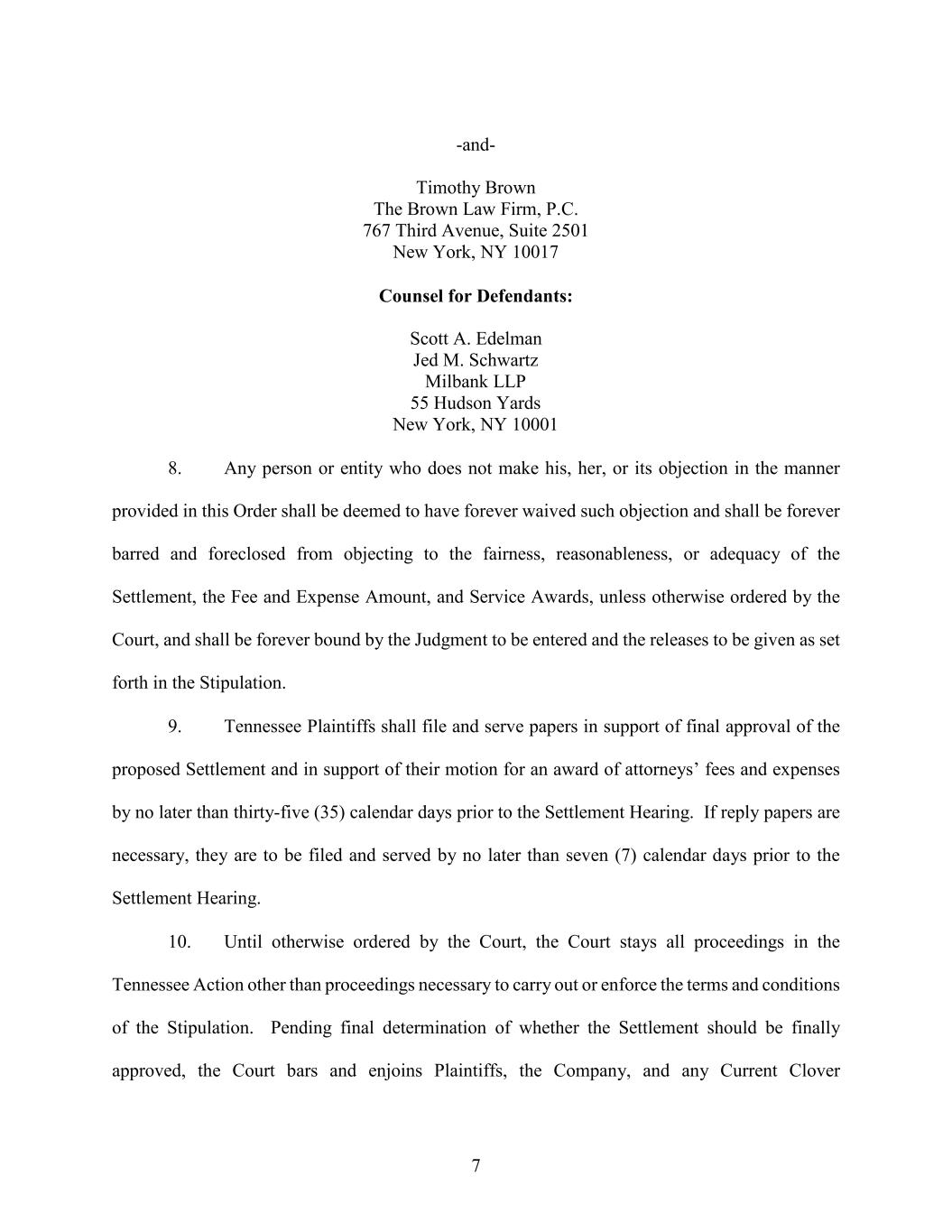 7 -and- Timothy Brown The Brown Law Firm, P.C. 767 Third Avenue, Suite 2501 New York, NY 10017 Counsel for Defendants: Scott A. Edelman Jed M. Schwartz Milbank LLP 55 Hudson Yards New York, NY 10001 8. Any person or entity who does not make his, her, or its objection in the manner provided in this Order shall be deemed to have forever waived such objection and shall be forever barred and foreclosed from objecting to the fairness, reasonableness, or adequacy of the Settlement, the Fee and Expense Amount, and Service Awards, unless otherwise ordered by the Court, and shall be forever bound by the Judgment to be entered and the releases to be given as set forth in the Stipulation. 9. Tennessee Plaintiffs shall file and serve papers in support of final approval of the proposed Settlement and in support of their motion for an award of attorneys’ fees and expenses by no later than thirty-five (35) calendar days prior to the Settlement Hearing. If reply papers are necessary, they are to be filed and served by no later than seven (7) calendar days prior to the Settlement Hearing. 10. Until otherwise ordered by the Court, the Court stays all proceedings in the Tennessee Action other than proceedings necessary to carry out or enforce the terms and conditions of the Stipulation. Pending final determination of whether the Settlement should be finally approved, the Court bars and enjoins Plaintiffs, the Company, and any Current Clover