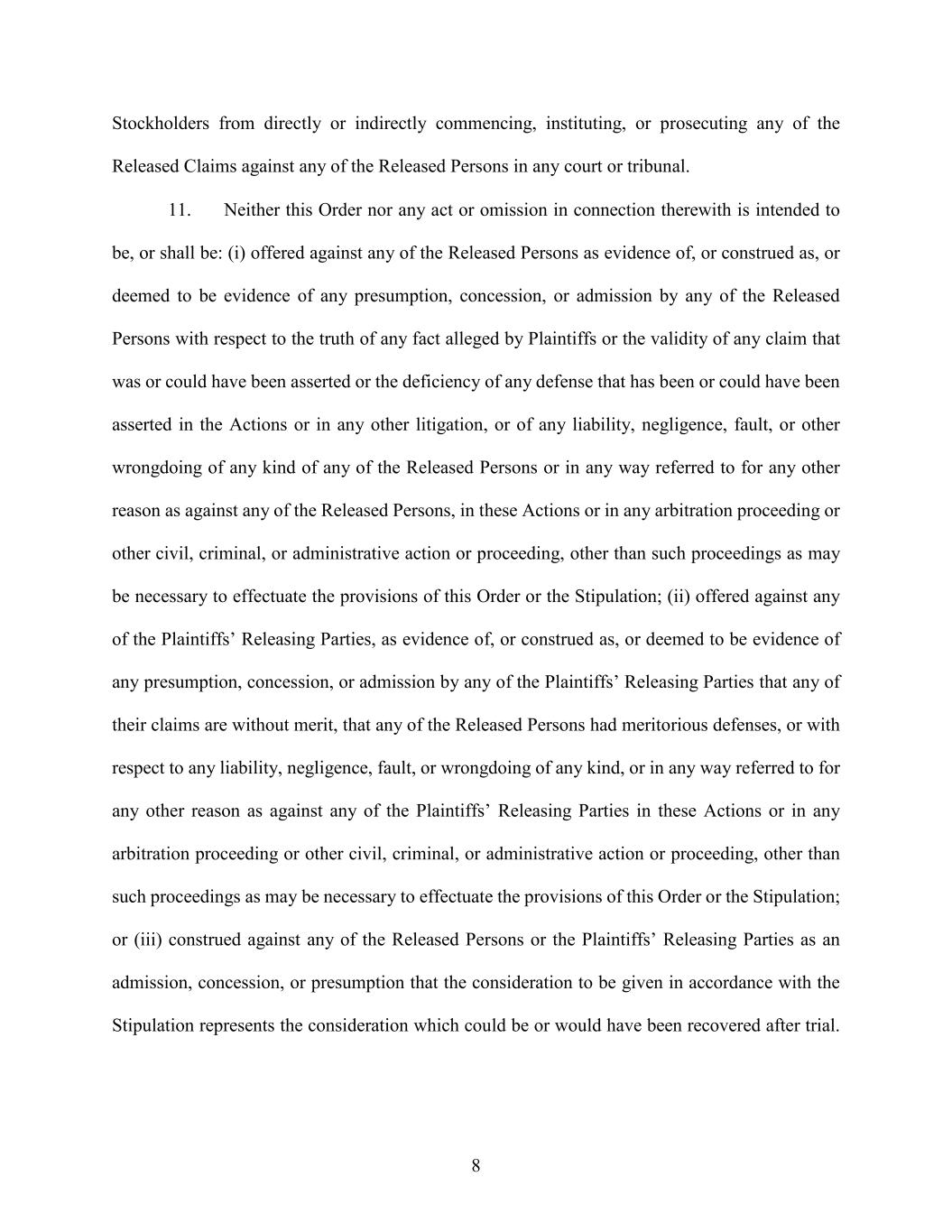 8 Stockholders from directly or indirectly commencing, instituting, or prosecuting any of the Released Claims against any of the Released Persons in any court or tribunal. 11. Neither this Order nor any act or omission in connection therewith is intended to be, or shall be: (i) offered against any of the Released Persons as evidence of, or construed as, or deemed to be evidence of any presumption, concession, or admission by any of the Released Persons with respect to the truth of any fact alleged by Plaintiffs or the validity of any claim that was or could have been asserted or the deficiency of any defense that has been or could have been asserted in the Actions or in any other litigation, or of any liability, negligence, fault, or other wrongdoing of any kind of any of the Released Persons or in any way referred to for any other reason as against any of the Released Persons, in these Actions or in any arbitration proceeding or other civil, criminal, or administrative action or proceeding, other than such proceedings as may be necessary to effectuate the provisions of this Order or the Stipulation; (ii) offered against any of the Plaintiffs’ Releasing Parties, as evidence of, or construed as, or deemed to be evidence of any presumption, concession, or admission by any of the Plaintiffs’ Releasing Parties that any of their claims are without merit, that any of the Released Persons had meritorious defenses, or with respect to any liability, negligence, fault, or wrongdoing of any kind, or in any way referred to for any other reason as against any of the Plaintiffs’ Releasing Parties in these Actions or in any arbitration proceeding or other civil, criminal, or administrative action or proceeding, other than such proceedings as may be necessary to effectuate the provisions of this Order or the Stipulation; or (iii) construed against any of the Released Persons or the Plaintiffs’ Releasing Parties as an admission, concession, or presumption that the consideration to be given in accordance with the Stipulation represents the consideration which could be or would have been recovered after trial.