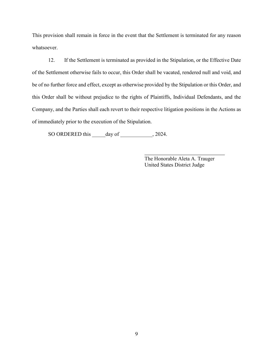 9 This provision shall remain in force in the event that the Settlement is terminated for any reason whatsoever. 12. If the Settlement is terminated as provided in the Stipulation, or the Effective Date of the Settlement otherwise fails to occur, this Order shall be vacated, rendered null and void, and be of no further force and effect, except as otherwise provided by the Stipulation or this Order, and this Order shall be without prejudice to the rights of Plaintiffs, Individual Defendants, and the Company, and the Parties shall each revert to their respective litigation positions in the Actions as of immediately prior to the execution of the Stipulation. SO ORDERED this _____day of ____________, 2024. The Honorable Aleta A. Trauger United States District Judge