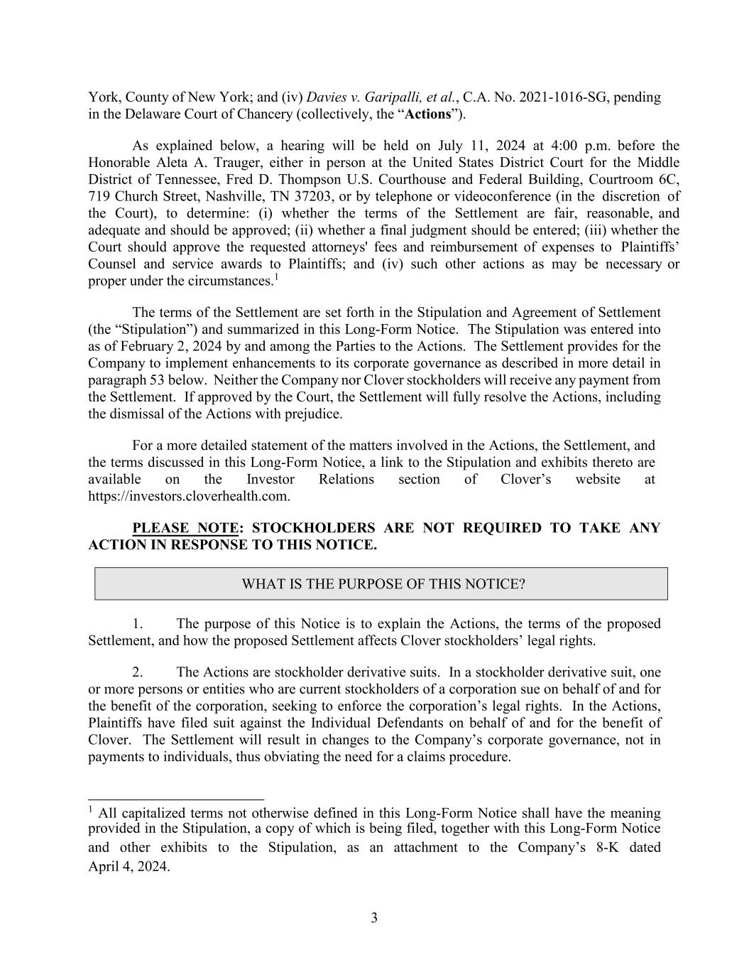 3 York, County of New York; and (iv) Davies v. Garipalli, et al., C.A. No. 2021-1016-SG, pending in the Delaware Court of Chancery (collectively, the “Actions”). As explained below, a hearing will be held on July 11, 2024 at 4:00 p.m. before the Honorable Aleta A. Trauger, either in person at the United States District Court for the Middle District of Tennessee, Fred D. Thompson U.S. Courthouse and Federal Building, Courtroom 6C, 719 Church Street, Nashville, TN 37203, or by telephone or videoconference (in the discretion of the Court), to determine: (i) whether the terms of the Settlement are fair, reasonable, and adequate and should be approved; (ii) whether a final judgment should be entered; (iii) whether the Court should approve the requested attorneys' fees and reimbursement of expenses to Plaintiffs’ Counsel and service awards to Plaintiffs; and (iv) such other actions as may be necessary or proper under the circumstances.1 The terms of the Settlement are set forth in the Stipulation and Agreement of Settlement (the “Stipulation”) and summarized in this Long-Form Notice. The Stipulation was entered into as of February 2, 2024 by and among the Parties to the Actions. The Settlement provides for the Company to implement enhancements to its corporate governance as described in more detail in paragraph 53 below. Neither the Company nor Clover stockholders will receive any payment from the Settlement. If approved by the Court, the Settlement will fully resolve the Actions, including the dismissal of the Actions with prejudice. For a more detailed statement of the matters involved in the Actions, the Settlement, and the terms discussed in this Long-Form Notice, a link to the Stipulation and exhibits thereto are available on the Investor Relations section of Clover’s website at https://investors.cloverhealth.com. PLEASE NOTE: STOCKHOLDERS ARE NOT REQUIRED TO TAKE ANY ACTION IN RESPONSE TO THIS NOTICE. WHAT IS THE PURPOSE OF THIS NOTICE? 1. The purpose of this Notice is to explain the Actions, the terms of the proposed Settlement, and how the proposed Settlement affects Clover stockholders’ legal rights. 2. The Actions are stockholder derivative suits. In a stockholder derivative suit, one or more persons or entities who are current stockholders of a corporation sue on behalf of and for the benefit of the corporation, seeking to enforce the corporation’s legal rights. In the Actions, Plaintiffs have filed suit against the Individual Defendants on behalf of and for the benefit of Clover. The Settlement will result in changes to the Company’s corporate governance, not in payments to individuals, thus obviating the need for a claims procedure. 1 All capitalized terms not otherwise defined in this Long-Form Notice shall have the meaning provided in the Stipulation, a copy of which is being filed, together with this Long-Form Notice and other exhibits to the Stipulation, as an attachment to the Company’s 8-K dated April 4, 2024.