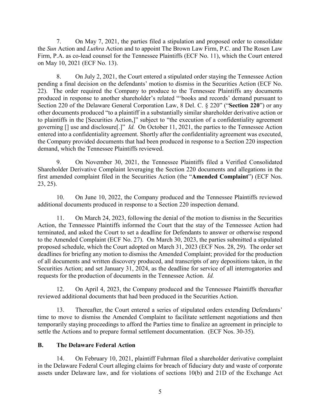 5 7. On May 7, 2021, the parties filed a stipulation and proposed order to consolidate the Sun Action and Luthra Action and to appoint The Brown Law Firm, P.C. and The Rosen Law Firm, P.A. as co-lead counsel for the Tennessee Plaintiffs (ECF No. 11), which the Court entered on May 10, 2021 (ECF No. 13). 8. On July 2, 2021, the Court entered a stipulated order staying the Tennessee Action pending a final decision on the defendants’ motion to dismiss in the Securities Action (ECF No. 22). The order required the Company to produce to the Tennessee Plaintiffs any documents produced in response to another shareholder’s related “‘books and records’ demand pursuant to Section 220 of the Delaware General Corporation Law, 8 Del. C. § 220” (“Section 220”) or any other documents produced “to a plaintiff in a substantially similar shareholder derivative action or to plaintiffs in the [Securities Action,]” subject to “the execution of a confidentiality agreement governing [] use and disclosure[.]” Id. On October 11, 2021, the parties to the Tennessee Action entered into a confidentiality agreement. Shortly after the confidentiality agreement was executed, the Company provided documents that had been produced in response to a Section 220 inspection demand, which the Tennessee Plaintiffs reviewed. 9. On November 30, 2021, the Tennessee Plaintiffs filed a Verified Consolidated Shareholder Derivative Complaint leveraging the Section 220 documents and allegations in the first amended complaint filed in the Securities Action (the “Amended Complaint”) (ECF Nos. 23, 25). 10. On June 10, 2022, the Company produced and the Tennessee Plaintiffs reviewed additional documents produced in response to a Section 220 inspection demand. 11. On March 24, 2023, following the denial of the motion to dismiss in the Securities Action, the Tennessee Plaintiffs informed the Court that the stay of the Tennessee Action had terminated, and asked the Court to set a deadline for Defendants to answer or otherwise respond to the Amended Complaint (ECF No. 27). On March 30, 2023, the parties submitted a stipulated proposed schedule, which the Court adopted on March 31, 2023 (ECF Nos. 28, 29). The order set deadlines for briefing any motion to dismiss the Amended Complaint; provided for the production of all documents and written discovery produced, and transcripts of any depositions taken, in the Securities Action; and set January 31, 2024, as the deadline for service of all interrogatories and requests for the production of documents in the Tennessee Action. Id. 12. On April 4, 2023, the Company produced and the Tennessee Plaintiffs thereafter reviewed additional documents that had been produced in the Securities Action. 13. Thereafter, the Court entered a series of stipulated orders extending Defendants’ time to move to dismiss the Amended Complaint to facilitate settlement negotiations and then temporarily staying proceedings to afford the Parties time to finalize an agreement in principle to settle the Actions and to prepare formal settlement documentation. (ECF Nos. 30-35). B. The Delaware Federal Action 14. On February 10, 2021, plaintiff Fuhrman filed a shareholder derivative complaint in the Delaware Federal Court alleging claims for breach of fiduciary duty and waste of corporate assets under Delaware law, and for violations of sections 10(b) and 21D of the Exchange Act