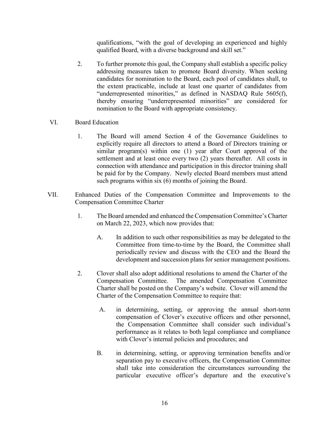 16 qualifications, “with the goal of developing an experienced and highly qualified Board, with a diverse background and skill set.” 2. To further promote this goal, the Company shall establish a specific policy addressing measures taken to promote Board diversity. When seeking candidates for nomination to the Board, each pool of candidates shall, to the extent practicable, include at least one quarter of candidates from “underrepresented minorities,” as defined in NASDAQ Rule 5605(f), thereby ensuring “underrepresented minorities” are considered for nomination to the Board with appropriate consistency. VI. Board Education 1. The Board will amend Section 4 of the Governance Guidelines to explicitly require all directors to attend a Board of Directors training or similar program(s) within one (1) year after Court approval of the settlement and at least once every two (2) years thereafter. All costs in connection with attendance and participation in this director training shall be paid for by the Company. Newly elected Board members must attend such programs within six (6) months of joining the Board. VII. Enhanced Duties of the Compensation Committee and Improvements to the Compensation Committee Charter 1. The Board amended and enhanced the Compensation Committee’s Charter on March 22, 2023, which now provides that: A. In addition to such other responsibilities as may be delegated to the Committee from time-to-time by the Board, the Committee shall periodically review and discuss with the CEO and the Board the development and succession plans for senior management positions. 2. Clover shall also adopt additional resolutions to amend the Charter of the Compensation Committee. The amended Compensation Committee Charter shall be posted on the Company’s website. Clover will amend the Charter of the Compensation Committee to require that: A. in determining, setting, or approving the annual short-term compensation of Clover’s executive officers and other personnel, the Compensation Committee shall consider such individual’s performance as it relates to both legal compliance and compliance with Clover’s internal policies and procedures; and B. in determining, setting, or approving termination benefits and/or separation pay to executive officers, the Compensation Committee shall take into consideration the circumstances surrounding the particular executive officer’s departure and the executive’s