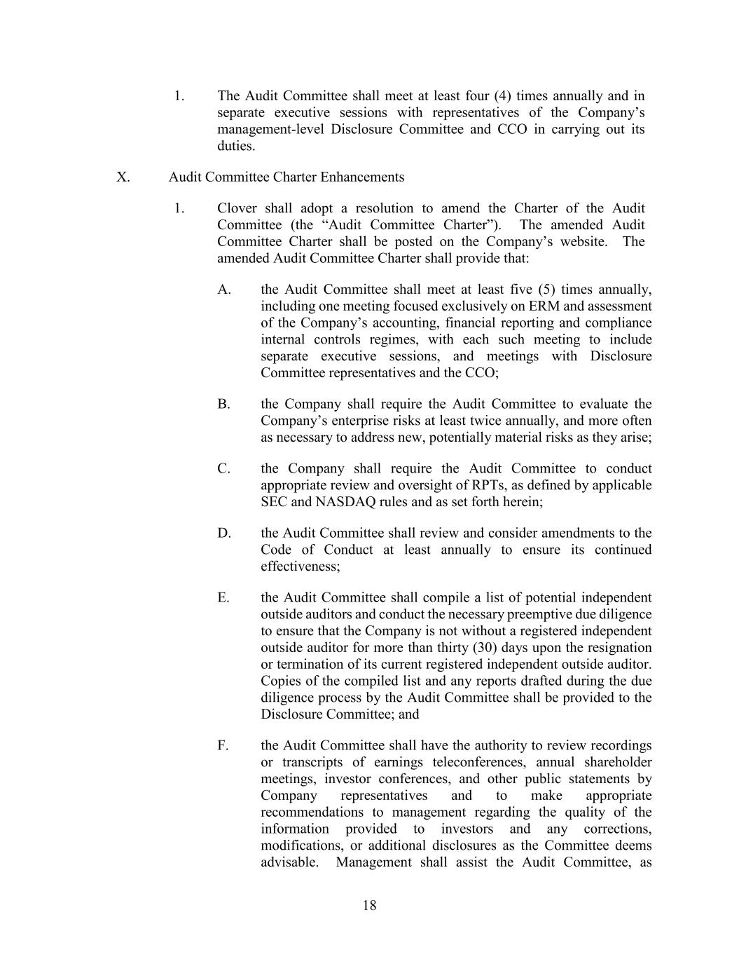 18 1. The Audit Committee shall meet at least four (4) times annually and in separate executive sessions with representatives of the Company’s management-level Disclosure Committee and CCO in carrying out its duties. X. Audit Committee Charter Enhancements 1. Clover shall adopt a resolution to amend the Charter of the Audit Committee (the “Audit Committee Charter”). The amended Audit Committee Charter shall be posted on the Company’s website. The amended Audit Committee Charter shall provide that: A. the Audit Committee shall meet at least five (5) times annually, including one meeting focused exclusively on ERM and assessment of the Company’s accounting, financial reporting and compliance internal controls regimes, with each such meeting to include separate executive sessions, and meetings with Disclosure Committee representatives and the CCO; B. the Company shall require the Audit Committee to evaluate the Company’s enterprise risks at least twice annually, and more often as necessary to address new, potentially material risks as they arise; C. the Company shall require the Audit Committee to conduct appropriate review and oversight of RPTs, as defined by applicable SEC and NASDAQ rules and as set forth herein; D. the Audit Committee shall review and consider amendments to the Code of Conduct at least annually to ensure its continued effectiveness; E. the Audit Committee shall compile a list of potential independent outside auditors and conduct the necessary preemptive due diligence to ensure that the Company is not without a registered independent outside auditor for more than thirty (30) days upon the resignation or termination of its current registered independent outside auditor. Copies of the compiled list and any reports drafted during the due diligence process by the Audit Committee shall be provided to the Disclosure Committee; and F. the Audit Committee shall have the authority to review recordings or transcripts of earnings teleconferences, annual shareholder meetings, investor conferences, and other public statements by Company representatives and to make appropriate recommendations to management regarding the quality of the information provided to investors and any corrections, modifications, or additional disclosures as the Committee deems advisable. Management shall assist the Audit Committee, as