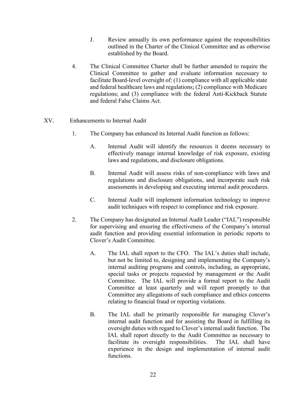 22 J. Review annually its own performance against the responsibilities outlined in the Charter of the Clinical Committee and as otherwise established by the Board. 4. The Clinical Committee Charter shall be further amended to require the Clinical Committee to gather and evaluate information necessary to facilitate Board-level oversight of: (1) compliance with all applicable state and federal healthcare laws and regulations; (2) compliance with Medicare regulations; and (3) compliance with the federal Anti-Kickback Statute and federal False Claims Act. XV. Enhancements to Internal Audit 1. The Company has enhanced its Internal Audit function as follows: A. Internal Audit will identify the resources it deems necessary to effectively manage internal knowledge of risk exposure, existing laws and regulations, and disclosure obligations. B. Internal Audit will assess risks of non-compliance with laws and regulations and disclosure obligations, and incorporate such risk assessments in developing and executing internal audit procedures. C. Internal Audit will implement information technology to improve audit techniques with respect to compliance and risk exposure. 2. The Company has designated an Internal Audit Leader (“IAL”) responsible for supervising and ensuring the effectiveness of the Company’s internal audit function and providing essential information in periodic reports to Clover’s Audit Committee. A. The IAL shall report to the CFO. The IAL’s duties shall include, but not be limited to, designing and implementing the Company’s internal auditing programs and controls, including, as appropriate, special tasks or projects requested by management or the Audit Committee. The IAL will provide a formal report to the Audit Committee at least quarterly and will report promptly to that Committee any allegations of such compliance and ethics concerns relating to financial fraud or reporting violations. B. The IAL shall be primarily responsible for managing Clover’s internal audit function and for assisting the Board in fulfilling its oversight duties with regard to Clover’s internal audit function. The IAL shall report directly to the Audit Committee as necessary to facilitate its oversight responsibilities. The IAL shall have experience in the design and implementation of internal audit functions.