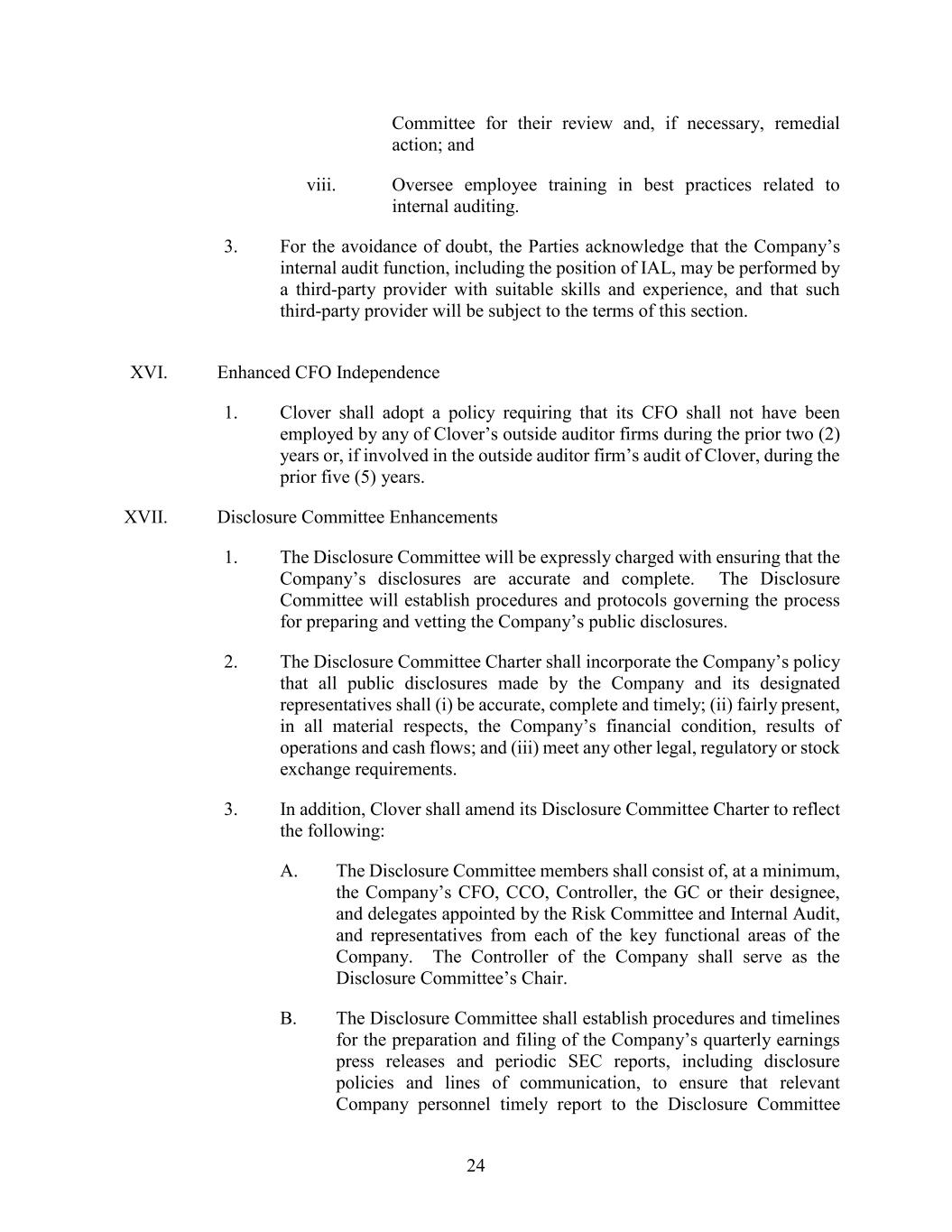 24 Committee for their review and, if necessary, remedial action; and viii. Oversee employee training in best practices related to internal auditing. 3. For the avoidance of doubt, the Parties acknowledge that the Company’s internal audit function, including the position of IAL, may be performed by a third-party provider with suitable skills and experience, and that such third-party provider will be subject to the terms of this section. XVI. Enhanced CFO Independence 1. Clover shall adopt a policy requiring that its CFO shall not have been employed by any of Clover’s outside auditor firms during the prior two (2) years or, if involved in the outside auditor firm’s audit of Clover, during the prior five (5) years. XVII. Disclosure Committee Enhancements 1. The Disclosure Committee will be expressly charged with ensuring that the Company’s disclosures are accurate and complete. The Disclosure Committee will establish procedures and protocols governing the process for preparing and vetting the Company’s public disclosures. 2. The Disclosure Committee Charter shall incorporate the Company’s policy that all public disclosures made by the Company and its designated representatives shall (i) be accurate, complete and timely; (ii) fairly present, in all material respects, the Company’s financial condition, results of operations and cash flows; and (iii) meet any other legal, regulatory or stock exchange requirements. 3. In addition, Clover shall amend its Disclosure Committee Charter to reflect the following: A. The Disclosure Committee members shall consist of, at a minimum, the Company’s CFO, CCO, Controller, the GC or their designee, and delegates appointed by the Risk Committee and Internal Audit, and representatives from each of the key functional areas of the Company. The Controller of the Company shall serve as the Disclosure Committee’s Chair. B. The Disclosure Committee shall establish procedures and timelines for the preparation and filing of the Company’s quarterly earnings press releases and periodic SEC reports, including disclosure policies and lines of communication, to ensure that relevant Company personnel timely report to the Disclosure Committee
