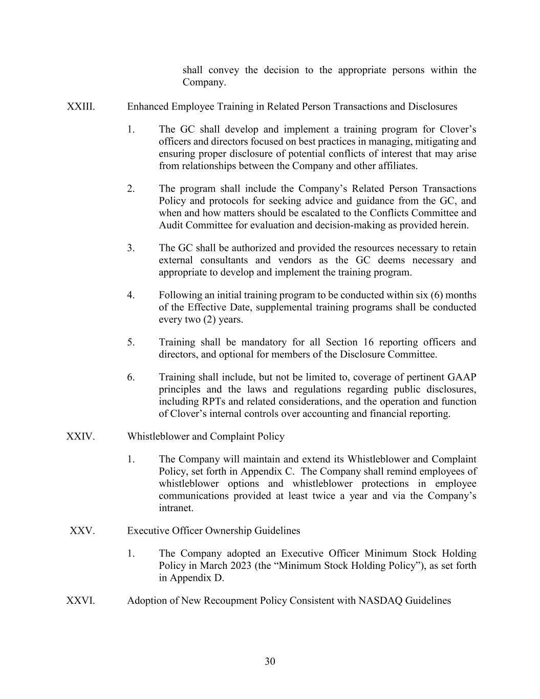 30 shall convey the decision to the appropriate persons within the Company. XXIII. Enhanced Employee Training in Related Person Transactions and Disclosures 1. The GC shall develop and implement a training program for Clover’s officers and directors focused on best practices in managing, mitigating and ensuring proper disclosure of potential conflicts of interest that may arise from relationships between the Company and other affiliates. 2. The program shall include the Company’s Related Person Transactions Policy and protocols for seeking advice and guidance from the GC, and when and how matters should be escalated to the Conflicts Committee and Audit Committee for evaluation and decision-making as provided herein. 3. The GC shall be authorized and provided the resources necessary to retain external consultants and vendors as the GC deems necessary and appropriate to develop and implement the training program. 4. Following an initial training program to be conducted within six (6) months of the Effective Date, supplemental training programs shall be conducted every two (2) years. 5. Training shall be mandatory for all Section 16 reporting officers and directors, and optional for members of the Disclosure Committee. 6. Training shall include, but not be limited to, coverage of pertinent GAAP principles and the laws and regulations regarding public disclosures, including RPTs and related considerations, and the operation and function of Clover’s internal controls over accounting and financial reporting. XXIV. Whistleblower and Complaint Policy 1. The Company will maintain and extend its Whistleblower and Complaint Policy, set forth in Appendix C. The Company shall remind employees of whistleblower options and whistleblower protections in employee communications provided at least twice a year and via the Company’s intranet. XXV. Executive Officer Ownership Guidelines 1. The Company adopted an Executive Officer Minimum Stock Holding Policy in March 2023 (the “Minimum Stock Holding Policy”), as set forth in Appendix D. XXVI. Adoption of New Recoupment Policy Consistent with NASDAQ Guidelines