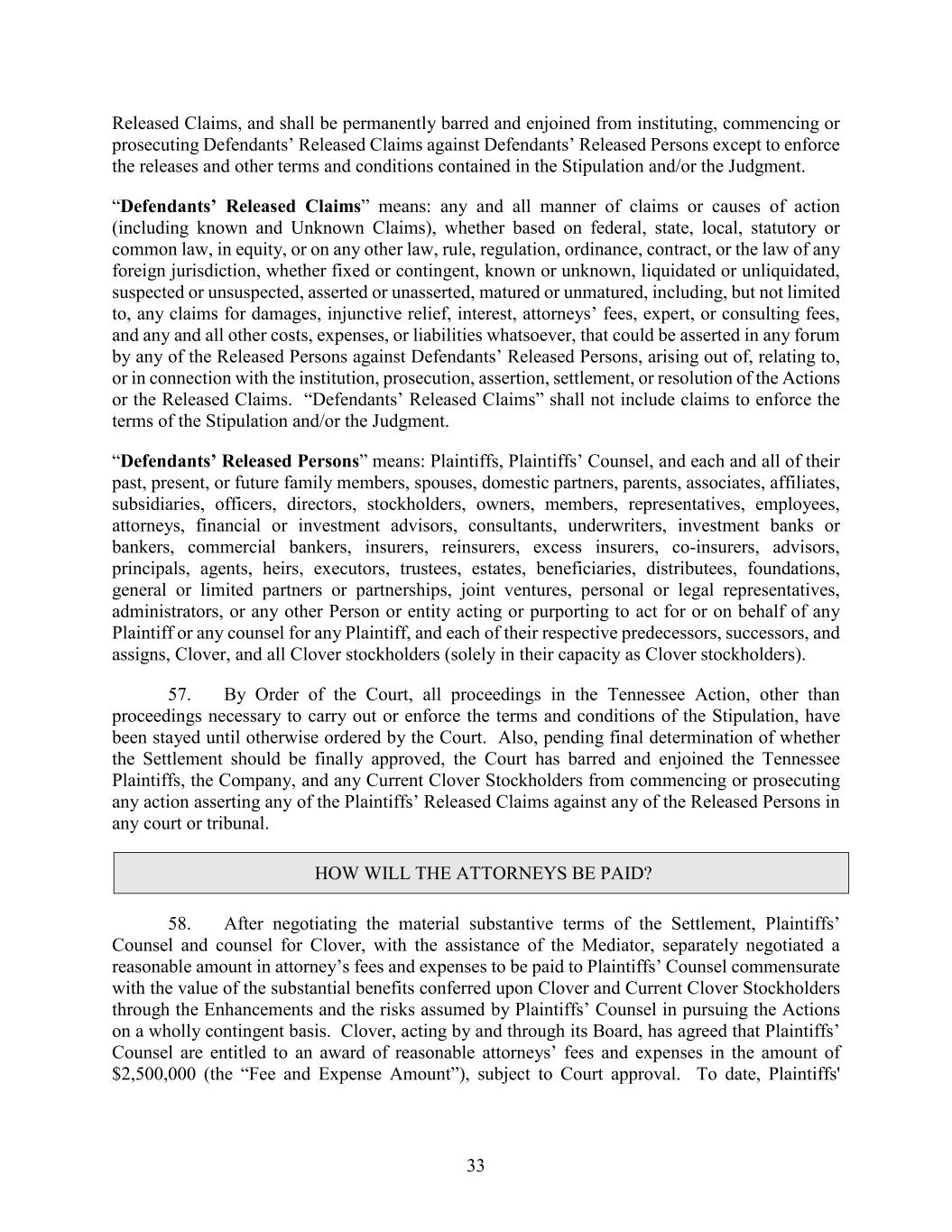 33 Released Claims, and shall be permanently barred and enjoined from instituting, commencing or prosecuting Defendants’ Released Claims against Defendants’ Released Persons except to enforce the releases and other terms and conditions contained in the Stipulation and/or the Judgment. “Defendants’ Released Claims” means: any and all manner of claims or causes of action (including known and Unknown Claims), whether based on federal, state, local, statutory or common law, in equity, or on any other law, rule, regulation, ordinance, contract, or the law of any foreign jurisdiction, whether fixed or contingent, known or unknown, liquidated or unliquidated, suspected or unsuspected, asserted or unasserted, matured or unmatured, including, but not limited to, any claims for damages, injunctive relief, interest, attorneys’ fees, expert, or consulting fees, and any and all other costs, expenses, or liabilities whatsoever, that could be asserted in any forum by any of the Released Persons against Defendants’ Released Persons, arising out of, relating to, or in connection with the institution, prosecution, assertion, settlement, or resolution of the Actions or the Released Claims. “Defendants’ Released Claims” shall not include claims to enforce the terms of the Stipulation and/or the Judgment. “Defendants’ Released Persons” means: Plaintiffs, Plaintiffs’ Counsel, and each and all of their past, present, or future family members, spouses, domestic partners, parents, associates, affiliates, subsidiaries, officers, directors, stockholders, owners, members, representatives, employees, attorneys, financial or investment advisors, consultants, underwriters, investment banks or bankers, commercial bankers, insurers, reinsurers, excess insurers, co-insurers, advisors, principals, agents, heirs, executors, trustees, estates, beneficiaries, distributees, foundations, general or limited partners or partnerships, joint ventures, personal or legal representatives, administrators, or any other Person or entity acting or purporting to act for or on behalf of any Plaintiff or any counsel for any Plaintiff, and each of their respective predecessors, successors, and assigns, Clover, and all Clover stockholders (solely in their capacity as Clover stockholders). 57. By Order of the Court, all proceedings in the Tennessee Action, other than proceedings necessary to carry out or enforce the terms and conditions of the Stipulation, have been stayed until otherwise ordered by the Court. Also, pending final determination of whether the Settlement should be finally approved, the Court has barred and enjoined the Tennessee Plaintiffs, the Company, and any Current Clover Stockholders from commencing or prosecuting any action asserting any of the Plaintiffs’ Released Claims against any of the Released Persons in any court or tribunal. HOW WILL THE ATTORNEYS BE PAID? 58. After negotiating the material substantive terms of the Settlement, Plaintiffs’ Counsel and counsel for Clover, with the assistance of the Mediator, separately negotiated a reasonable amount in attorney’s fees and expenses to be paid to Plaintiffs’ Counsel commensurate with the value of the substantial benefits conferred upon Clover and Current Clover Stockholders through the Enhancements and the risks assumed by Plaintiffs’ Counsel in pursuing the Actions on a wholly contingent basis. Clover, acting by and through its Board, has agreed that Plaintiffs’ Counsel are entitled to an award of reasonable attorneys’ fees and expenses in the amount of $2,500,000 (the “Fee and Expense Amount”), subject to Court approval. To date, Plaintiffs'