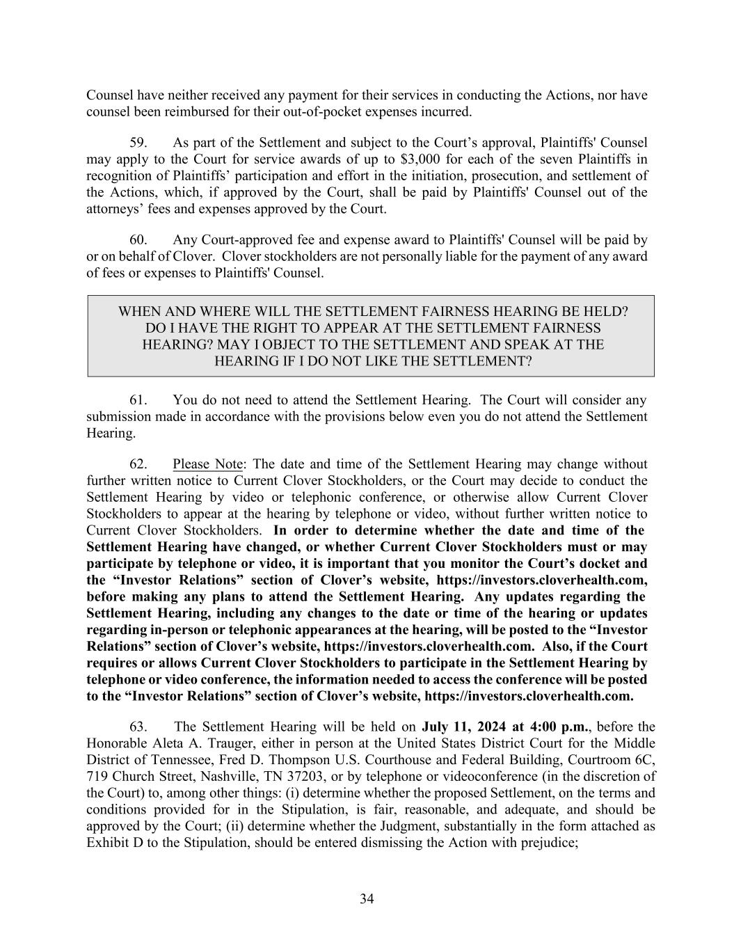 34 Counsel have neither received any payment for their services in conducting the Actions, nor have counsel been reimbursed for their out-of-pocket expenses incurred. 59. As part of the Settlement and subject to the Court’s approval, Plaintiffs' Counsel may apply to the Court for service awards of up to $3,000 for each of the seven Plaintiffs in recognition of Plaintiffs’ participation and effort in the initiation, prosecution, and settlement of the Actions, which, if approved by the Court, shall be paid by Plaintiffs' Counsel out of the attorneys’ fees and expenses approved by the Court. 60. Any Court-approved fee and expense award to Plaintiffs' Counsel will be paid by or on behalf of Clover. Clover stockholders are not personally liable for the payment of any award of fees or expenses to Plaintiffs' Counsel. WHEN AND WHERE WILL THE SETTLEMENT FAIRNESS HEARING BE HELD? DO I HAVE THE RIGHT TO APPEAR AT THE SETTLEMENT FAIRNESS HEARING? MAY I OBJECT TO THE SETTLEMENT AND SPEAK AT THE HEARING IF I DO NOT LIKE THE SETTLEMENT? 61. You do not need to attend the Settlement Hearing. The Court will consider any submission made in accordance with the provisions below even you do not attend the Settlement Hearing. 62. Please Note: The date and time of the Settlement Hearing may change without further written notice to Current Clover Stockholders, or the Court may decide to conduct the Settlement Hearing by video or telephonic conference, or otherwise allow Current Clover Stockholders to appear at the hearing by telephone or video, without further written notice to Current Clover Stockholders. In order to determine whether the date and time of the Settlement Hearing have changed, or whether Current Clover Stockholders must or may participate by telephone or video, it is important that you monitor the Court’s docket and the “Investor Relations” section of Clover’s website, https://investors.cloverhealth.com, before making any plans to attend the Settlement Hearing. Any updates regarding the Settlement Hearing, including any changes to the date or time of the hearing or updates regarding in-person or telephonic appearances at the hearing, will be posted to the “Investor Relations” section of Clover’s website, https://investors.cloverhealth.com. Also, if the Court requires or allows Current Clover Stockholders to participate in the Settlement Hearing by telephone or video conference, the information needed to access the conference will be posted to the “Investor Relations” section of Clover’s website, https://investors.cloverhealth.com. 63. The Settlement Hearing will be held on July 11, 2024 at 4:00 p.m., before the Honorable Aleta A. Trauger, either in person at the United States District Court for the Middle District of Tennessee, Fred D. Thompson U.S. Courthouse and Federal Building, Courtroom 6C, 719 Church Street, Nashville, TN 37203, or by telephone or videoconference (in the discretion of the Court) to, among other things: (i) determine whether the proposed Settlement, on the terms and conditions provided for in the Stipulation, is fair, reasonable, and adequate, and should be approved by the Court; (ii) determine whether the Judgment, substantially in the form attached as Exhibit D to the Stipulation, should be entered dismissing the Action with prejudice;