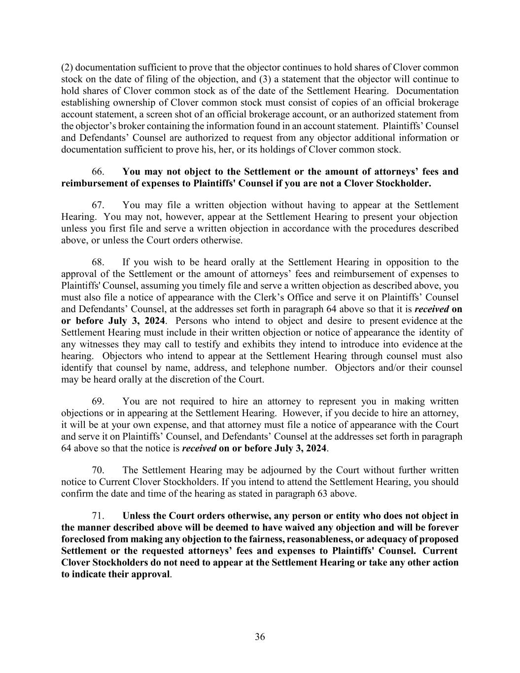 36 (2) documentation sufficient to prove that the objector continues to hold shares of Clover common stock on the date of filing of the objection, and (3) a statement that the objector will continue to hold shares of Clover common stock as of the date of the Settlement Hearing. Documentation establishing ownership of Clover common stock must consist of copies of an official brokerage account statement, a screen shot of an official brokerage account, or an authorized statement from the objector’s broker containing the information found in an account statement. Plaintiffs’ Counsel and Defendants’ Counsel are authorized to request from any objector additional information or documentation sufficient to prove his, her, or its holdings of Clover common stock. 66. You may not object to the Settlement or the amount of attorneys’ fees and reimbursement of expenses to Plaintiffs' Counsel if you are not a Clover Stockholder. 67. You may file a written objection without having to appear at the Settlement Hearing. You may not, however, appear at the Settlement Hearing to present your objection unless you first file and serve a written objection in accordance with the procedures described above, or unless the Court orders otherwise. 68. If you wish to be heard orally at the Settlement Hearing in opposition to the approval of the Settlement or the amount of attorneys’ fees and reimbursement of expenses to Plaintiffs' Counsel, assuming you timely file and serve a written objection as described above, you must also file a notice of appearance with the Clerk’s Office and serve it on Plaintiffs’ Counsel and Defendants’ Counsel, at the addresses set forth in paragraph 64 above so that it is received on or before July 3, 2024. Persons who intend to object and desire to present evidence at the Settlement Hearing must include in their written objection or notice of appearance the identity of any witnesses they may call to testify and exhibits they intend to introduce into evidence at the hearing. Objectors who intend to appear at the Settlement Hearing through counsel must also identify that counsel by name, address, and telephone number. Objectors and/or their counsel may be heard orally at the discretion of the Court. 69. You are not required to hire an attorney to represent you in making written objections or in appearing at the Settlement Hearing. However, if you decide to hire an attorney, it will be at your own expense, and that attorney must file a notice of appearance with the Court and serve it on Plaintiffs’ Counsel, and Defendants’ Counsel at the addresses set forth in paragraph 64 above so that the notice is received on or before July 3, 2024. 70. The Settlement Hearing may be adjourned by the Court without further written notice to Current Clover Stockholders. If you intend to attend the Settlement Hearing, you should confirm the date and time of the hearing as stated in paragraph 63 above. 71. Unless the Court orders otherwise, any person or entity who does not object in the manner described above will be deemed to have waived any objection and will be forever foreclosed from making any objection to the fairness, reasonableness, or adequacy of proposed Settlement or the requested attorneys’ fees and expenses to Plaintiffs' Counsel. Current Clover Stockholders do not need to appear at the Settlement Hearing or take any other action to indicate their approval.